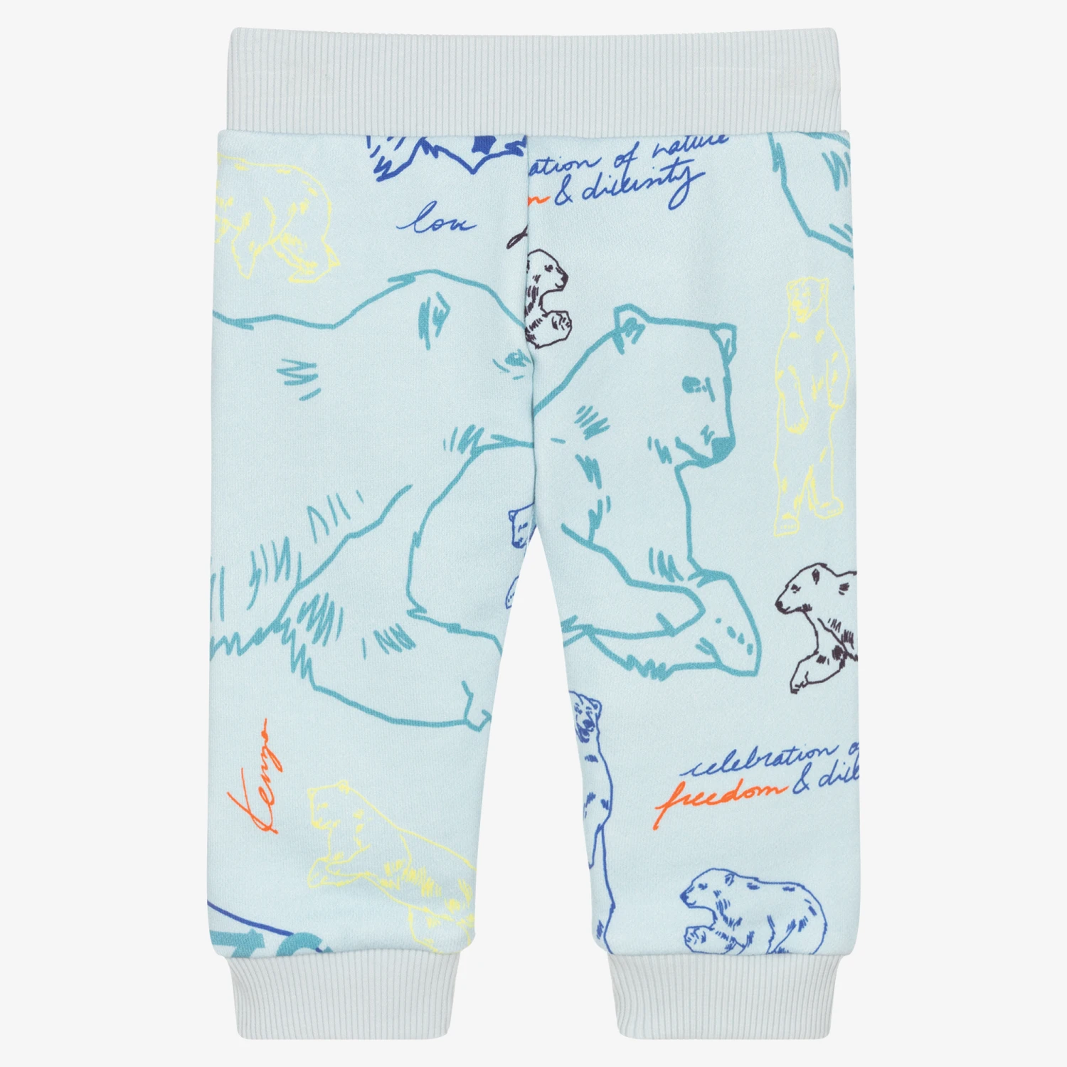 Pale blue joggers for little boys by KENZO KIDS, made in soft cotton sweatshirt jersey. They have a Nova baby print of polar bears, side pockets and an elasticated drawstring waist for comfort.
