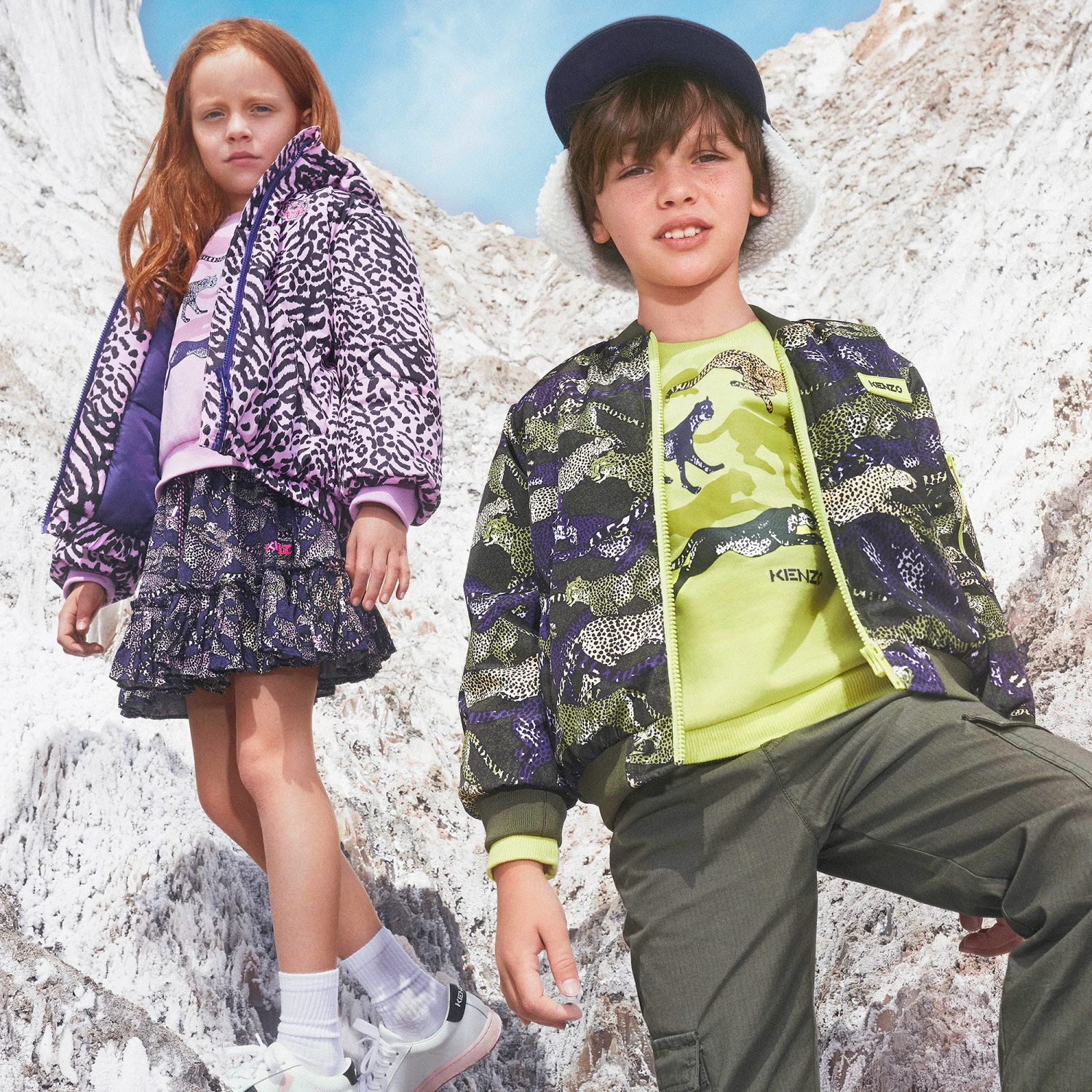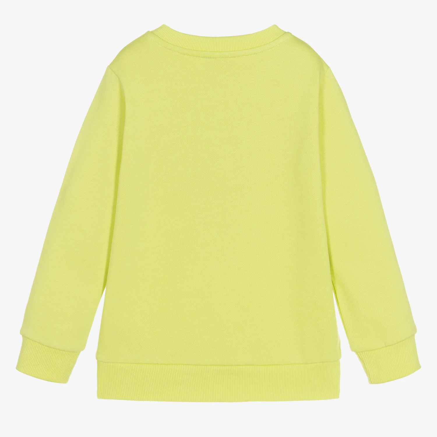 Bright lime green sweatshirt for boys by KENZO KIDS, made in soft, mid-weight cotton jersey, with a fleecy inside. It has a running cheetah print on the front in shades of green, purple and ivory, with a purple logo print underneath and ribbed trims.