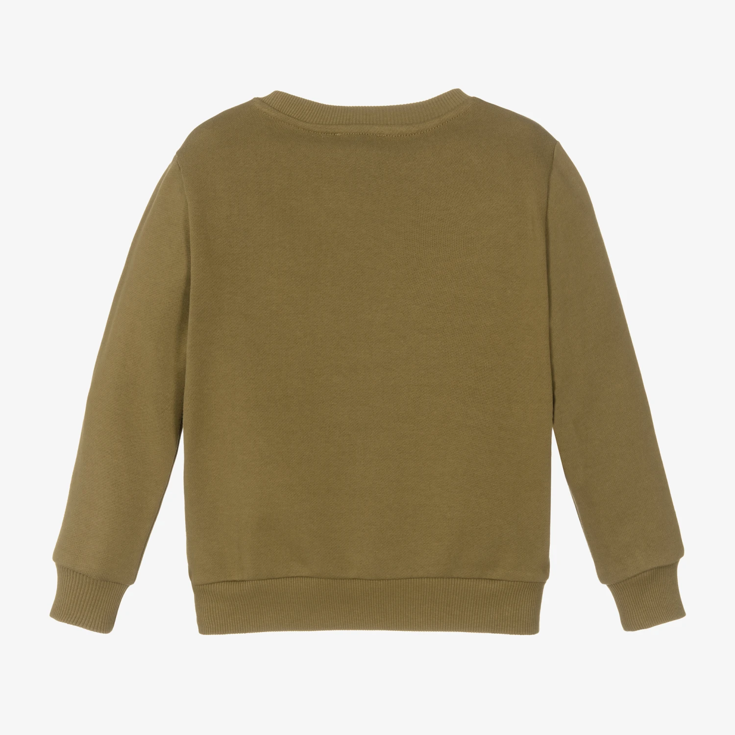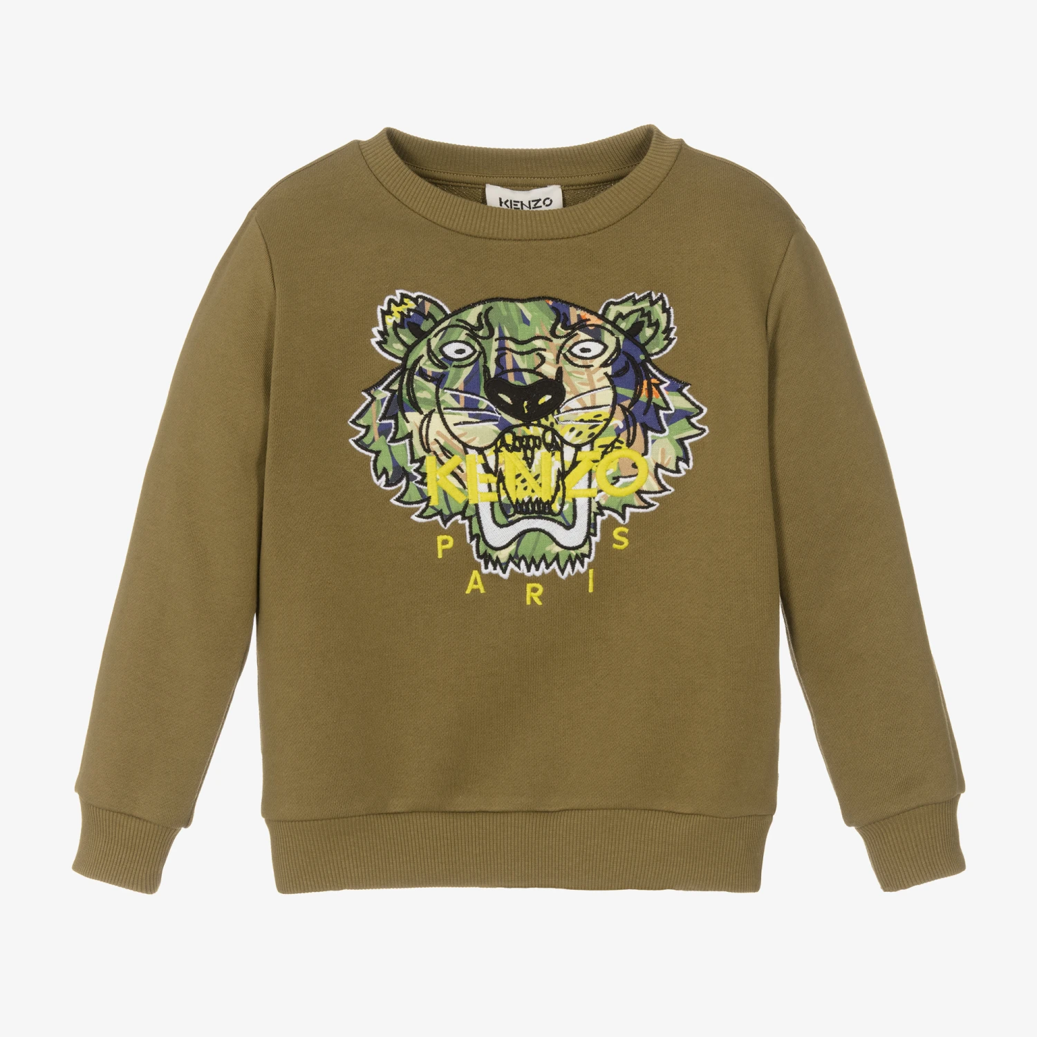 Comfortable khaki green sweatshirt for boys by KENZO KIDS, made in mid-weight cotton jersey. The brand’s iconic Tiger logo is embroidered on the front, with an eye-catching tropical pattern and a neon green logo.