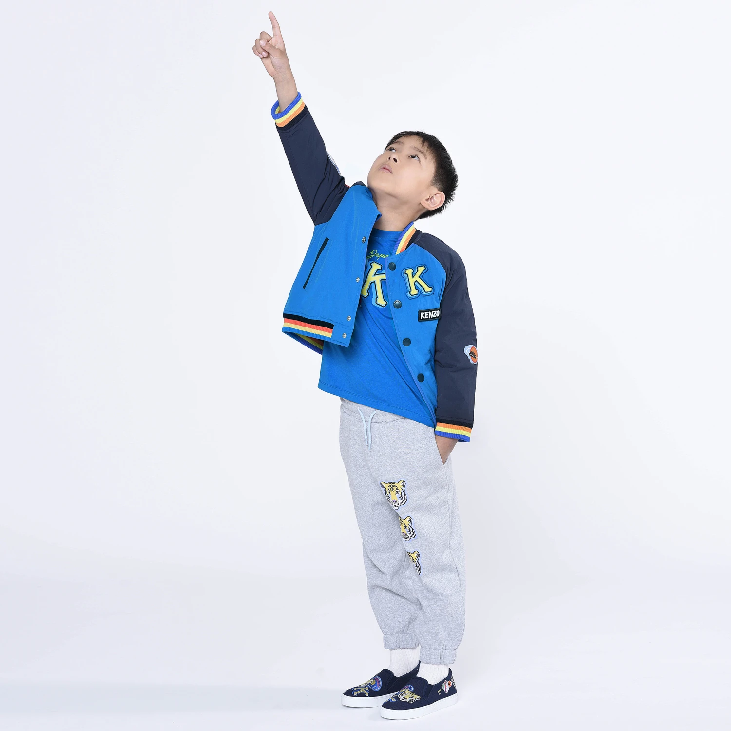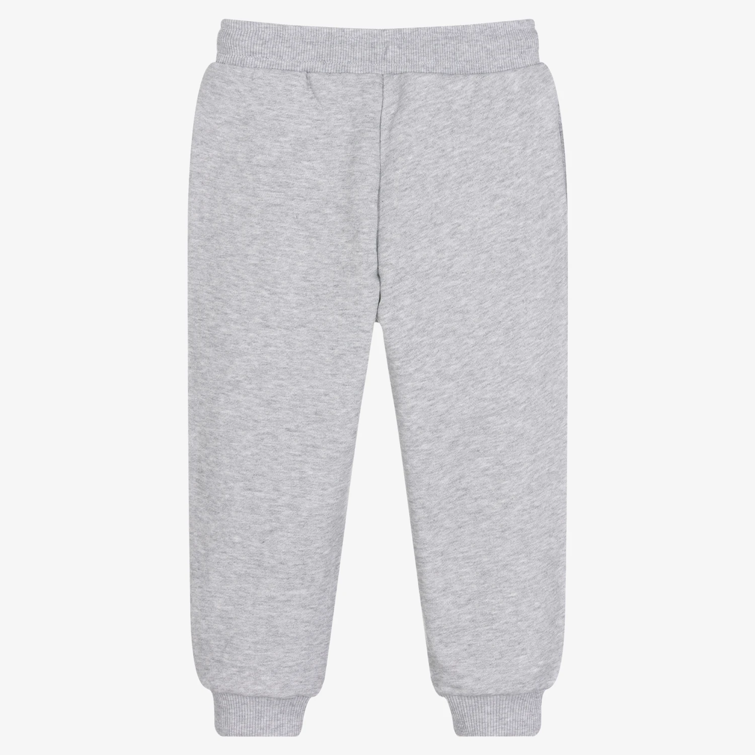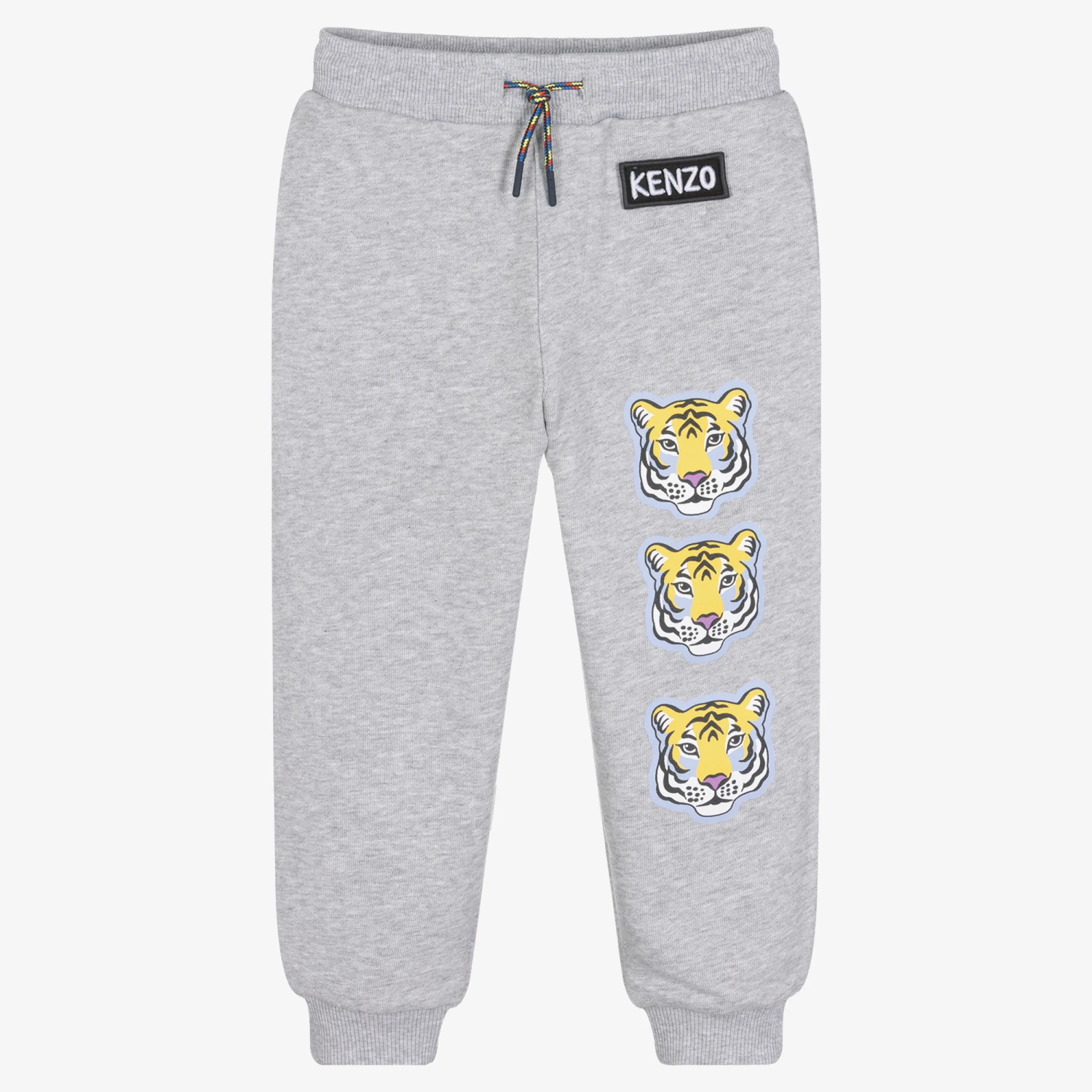 Logo-inspired grey marl joggers for boys by KENZO KIDS, made in soft, mid-weight jersey. There is a black and white logo appliqué on one leg for a recognisable look, and yellow and blue Tigers in a cool striped design down the leg. They have a colourful drawstring on the stretchy waist and ribbed trims for comfortable lounging.
