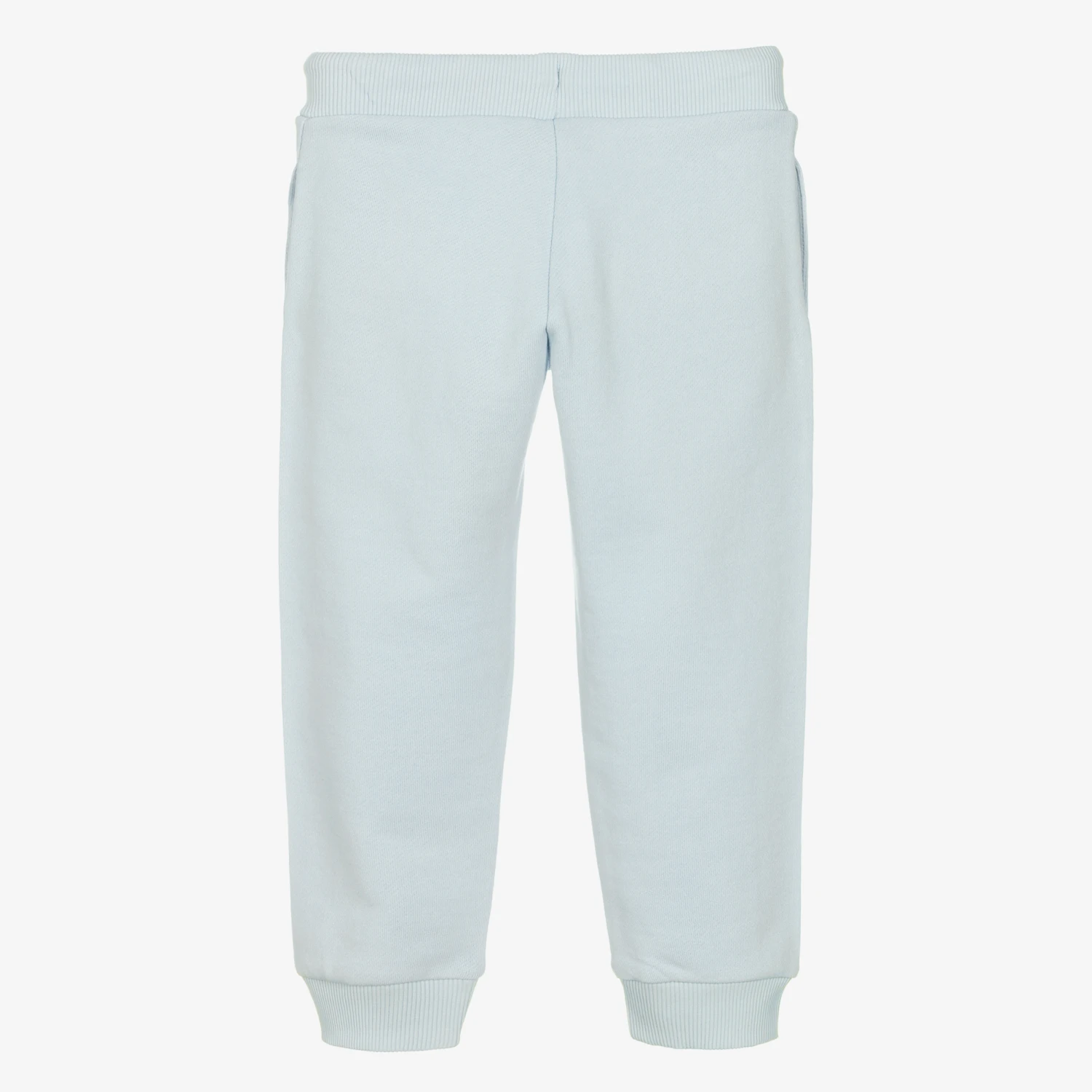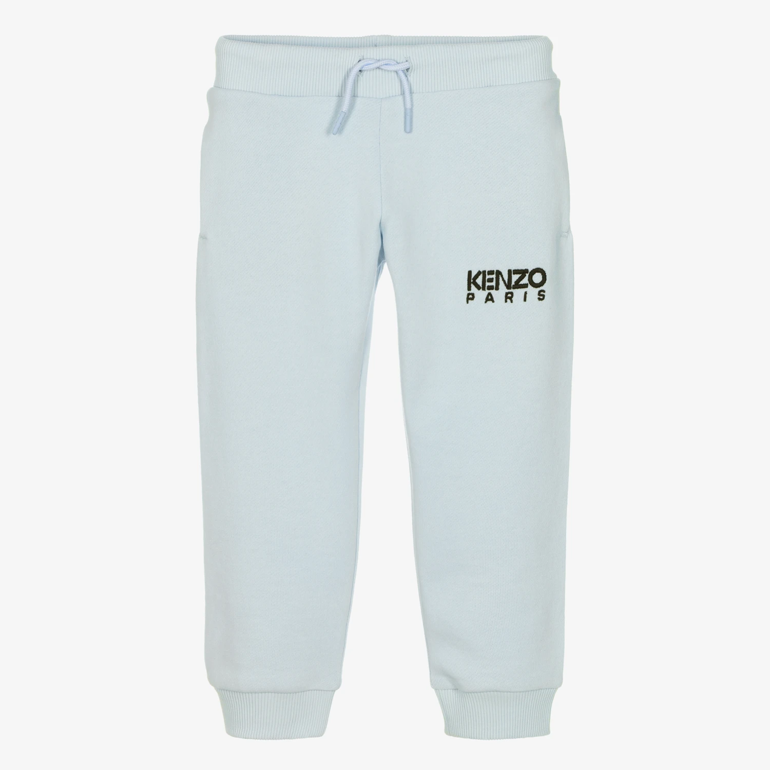 Cool pale blue cotton jersey joggers for boys by KENZO KIDS. They are comfortable with an elasticated waist and cuffs, the waist of which can be adjusted with a drawstring for a better fit. The Kenzo Paris logo is embroidered on the front in black for a branded finish.