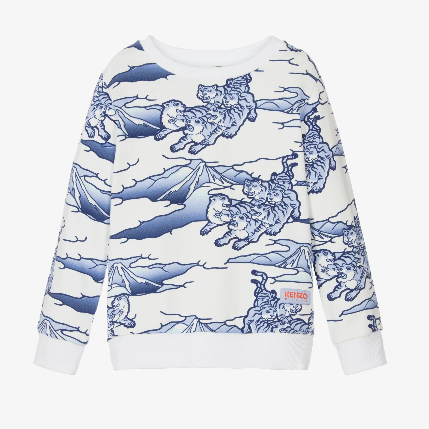 Eye-catching white and blue sweatshirt for boys from KENZO KIDS. Made in soft cotton jersey, it is comfortable and casual with ribbed trims. The all-over Kenzo Rainbow print with multiple Tigers gives a quirky finish.