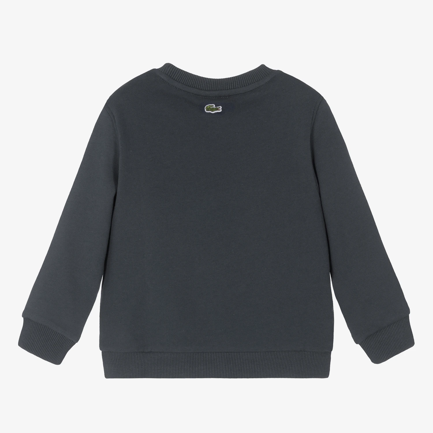 Blue-grey sweatshirt for boys by Lacoste, made in soft organic cotton jersey. It has a crew neckline and ribbed trims for a snug fit. There is a cartoon-inspired logo print on the front, with the embroidered crocodile logo sewn on the back of the neck for added designer appeal.