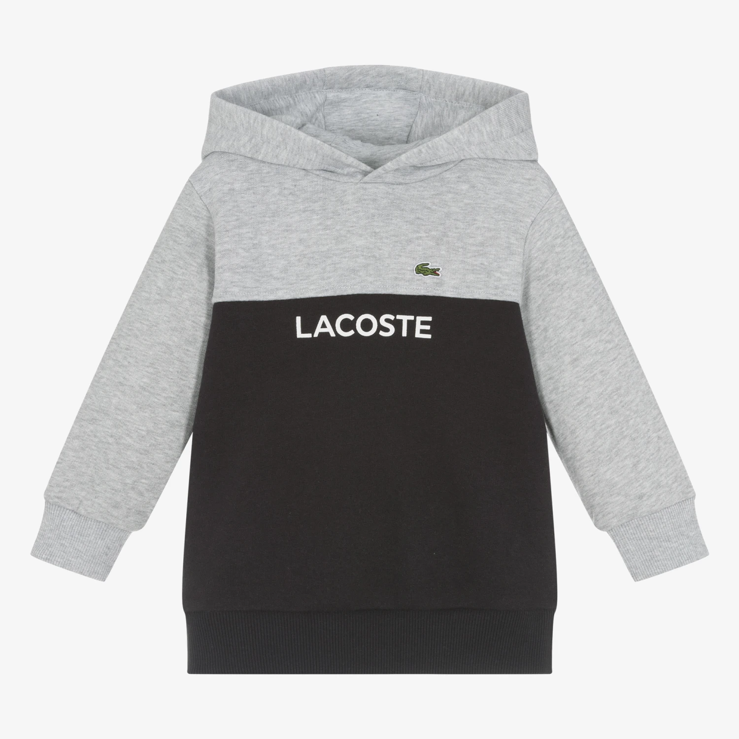 Navy blue and grey marl hoodie for boys by Lacoste. It is made in comfortable cotton blend jersey. with a warm fleecy inside. There is a white logo print across the front, with the iconic embroidered crocodile logo chest.