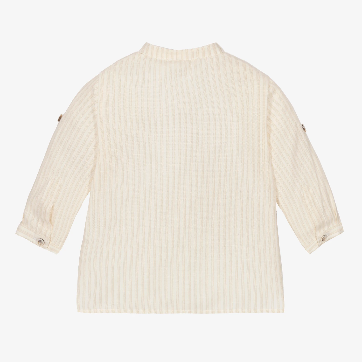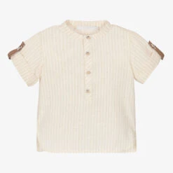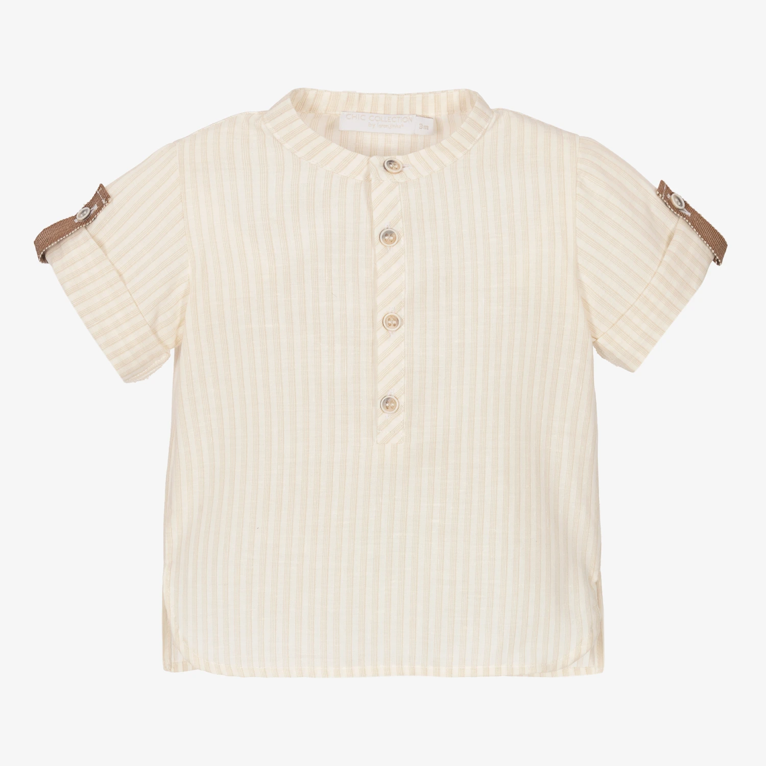 Beige and ivory striped popover shirt for boys by Portuguese brand, Laranjinha. Made in soft and lightweight woven cotton, this comfortable relaxed style has a round neck and a half button placket on the front. The sleeves fasten with buttons on the cuffs and can also be rolled up and secured with a tab for a more casual look. The hem is shaped at the front and split at the sides for ease of movement.