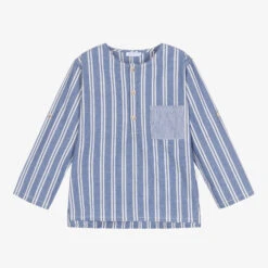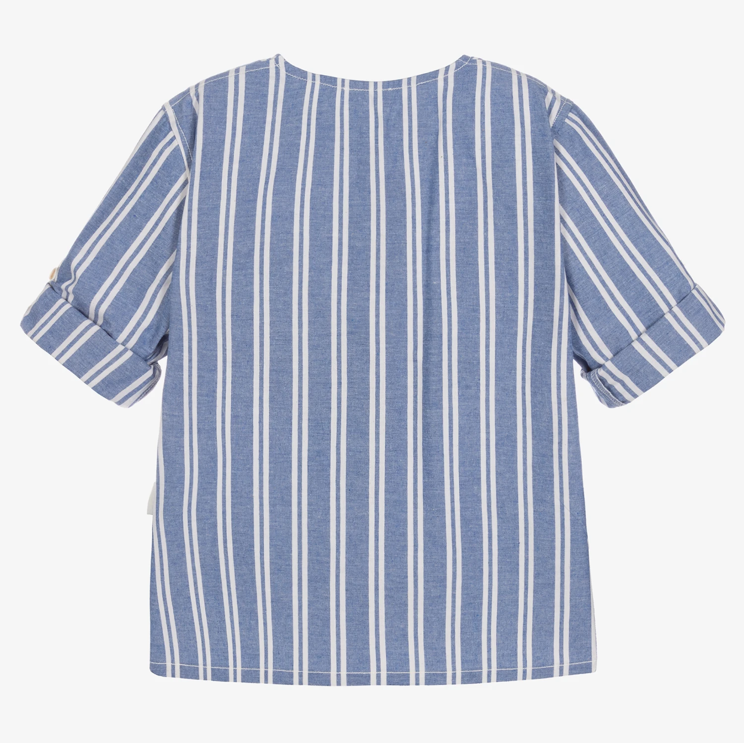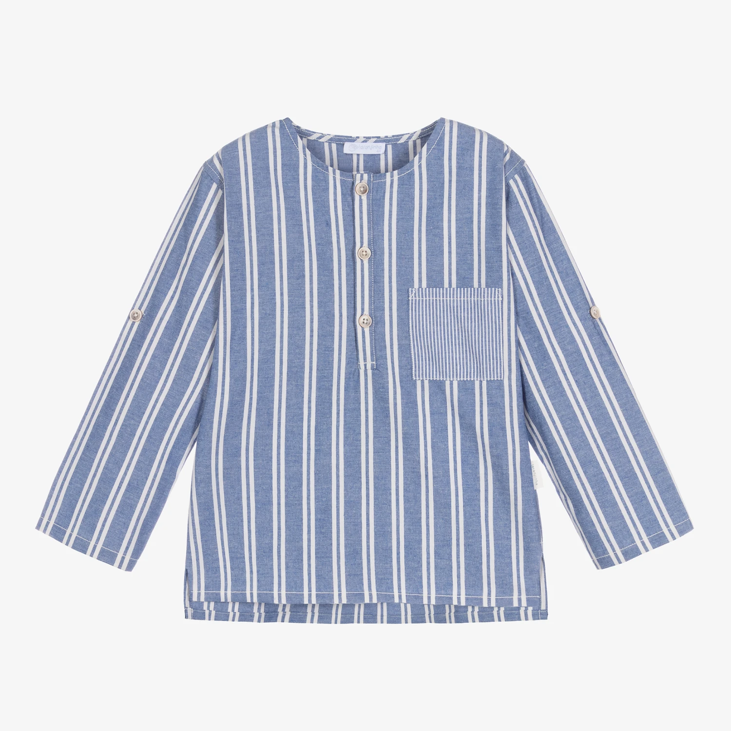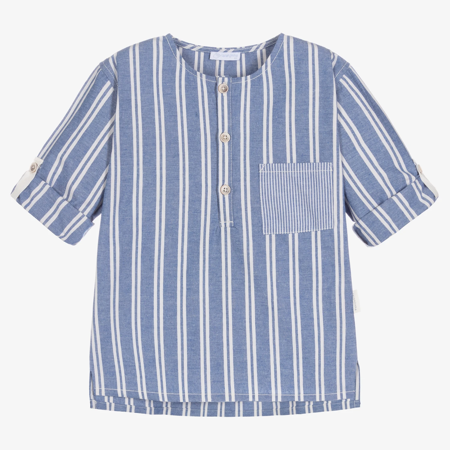 In a maxi stripe design, this blue and white popover shirt for boys is by Portuguese brand, Laranjinha. Made in a soft blend of organic and recycled cotton, this comfortable relaxed style has a round neck and a half button placket on the front. There is a contrast stripe chest pocket and the sleeves can be rolled up and secured with button tabs. For ease of movement, it has a split hem that is slightly longer at the back.