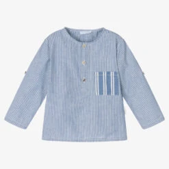 In a miniature stripe design, this blue and white popover shirt for boys is by Portuguese brand, Laranjinha. Made in a soft blend of organic and recycled cotton, this comfortable relaxed style has a round neck and a half button placket on the front. There is a contrast stripe chest pocket and the sleeves can be rolled up and secured with button tabs. For ease of movement, it has a split hem that is slightly longer at the back.