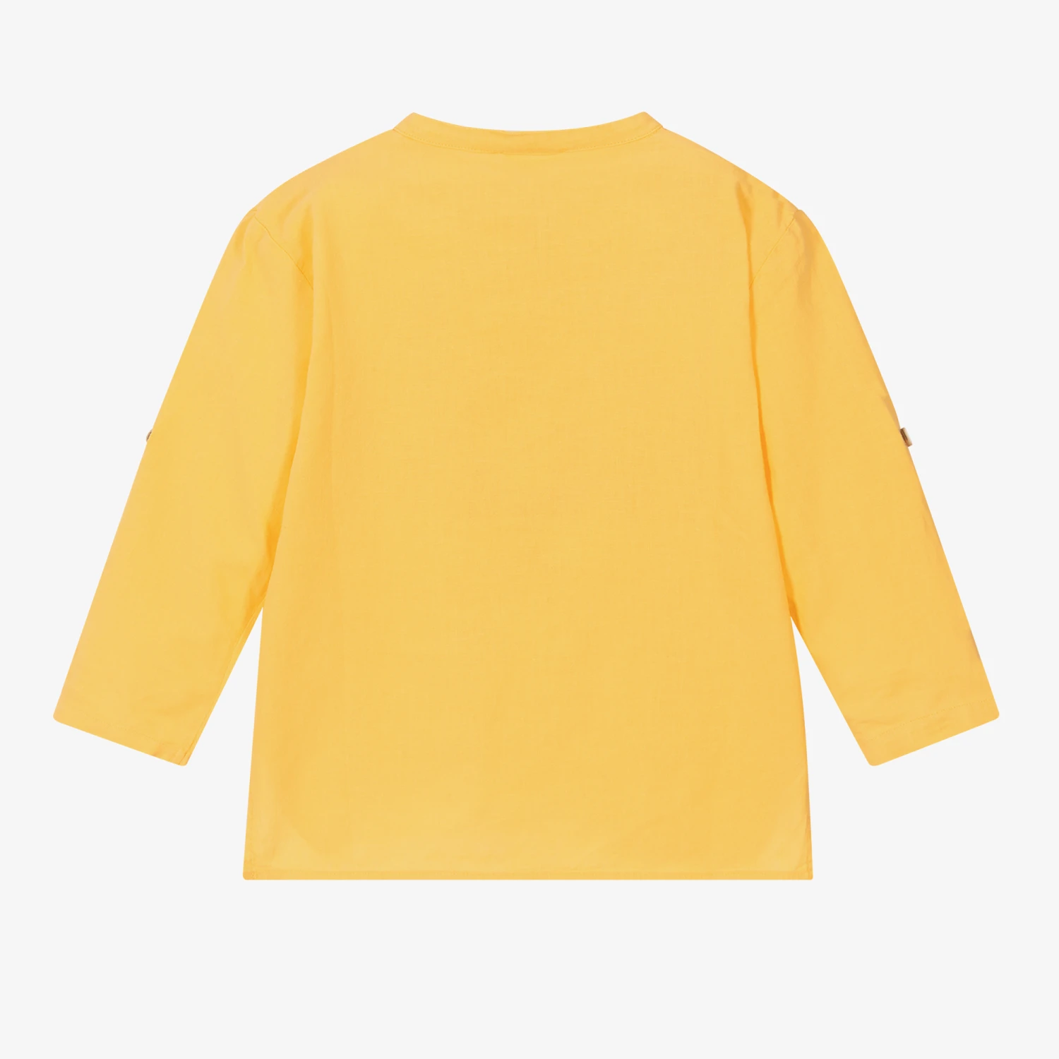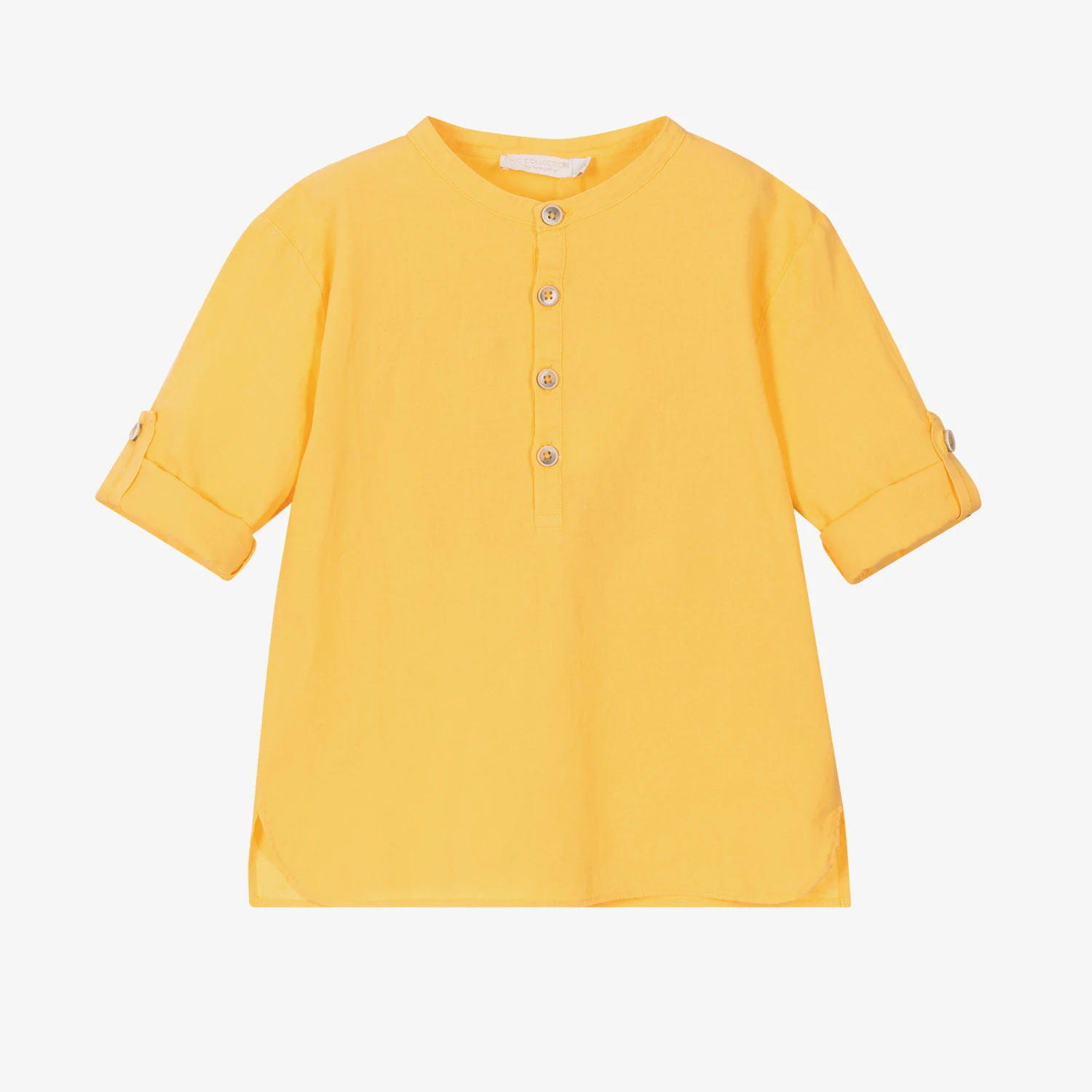 Dark yellow popover shirt for boys from Laranjinha, in a soft and lightweight linen and cotton blend. Stylish for warmer days, this round neck design has a half button placket on the front and sleeves that can be rolled up and secured with a button. The hem is shaped at the front and split at the sides for ease of movement.