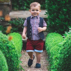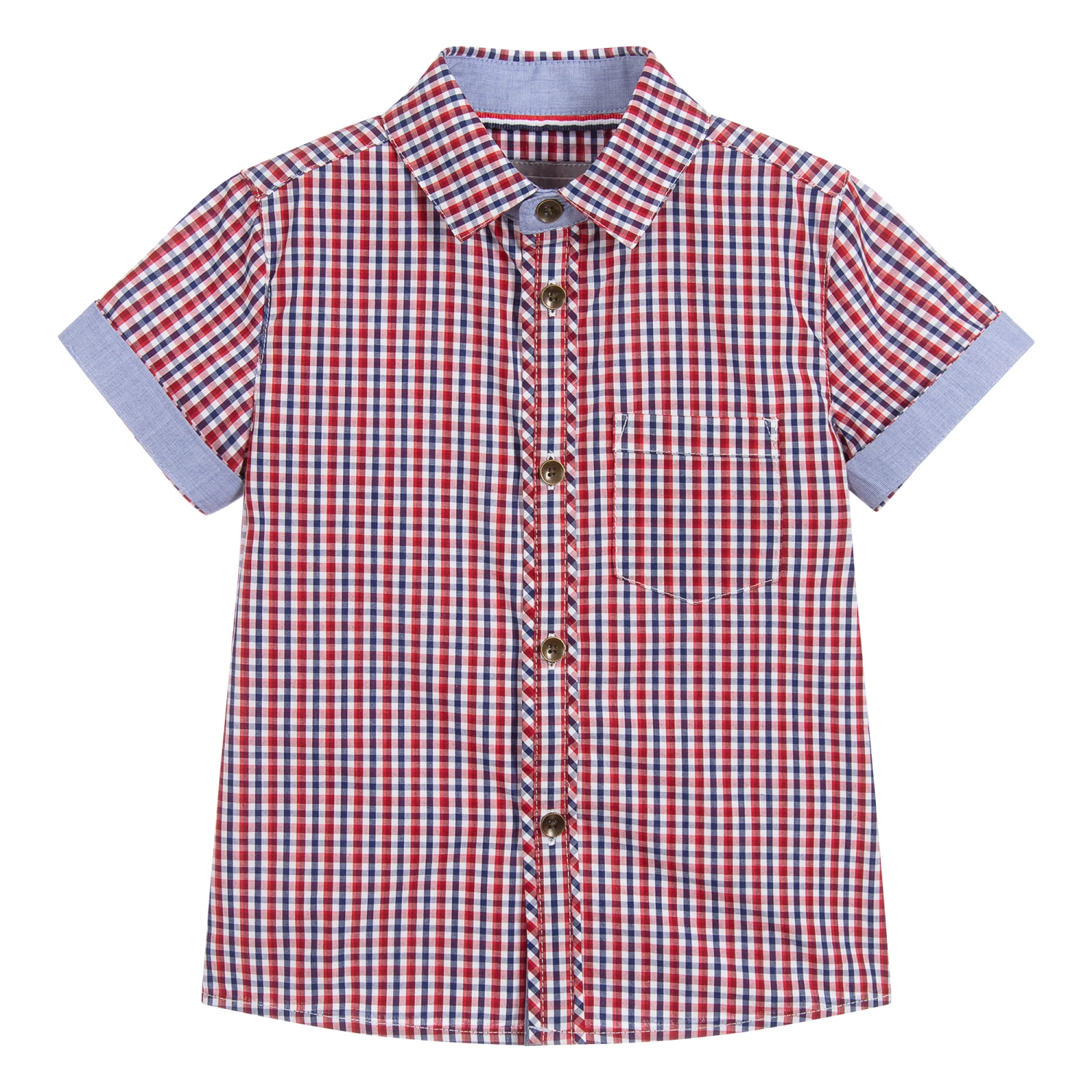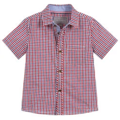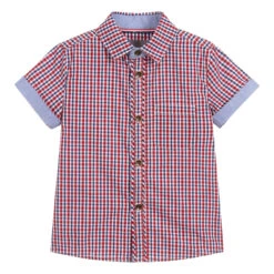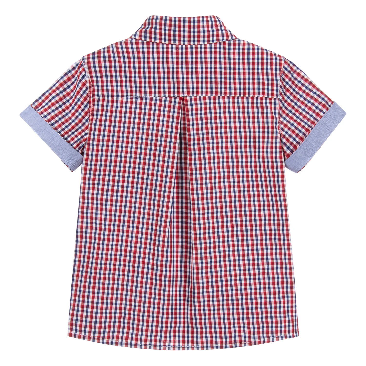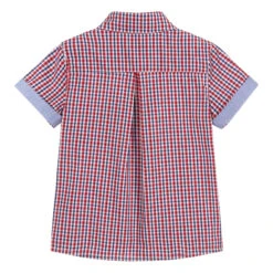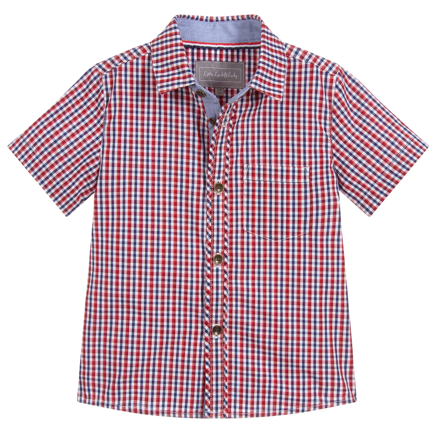 Boys red, white and blue check shirt from Little Lord & Lady. It is made in lightweight cotton with blue trim under the collar and cuffs, and fastens with brown buttons.