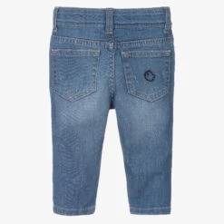Mid-blue wash jeans for boys by Lyle & Scott, made in soft, stretch denim. With classic five pocket styling, they have faded patches on the front and back. The brand’s signature embroidered golden Eagle logo patch is on the back pocket and there is a brown embossed logo patch on the back of the waistband and a logo patch on the front coin pocket. They have a useful adjustable waist for a comfortable fit and fasten with a button and zip.