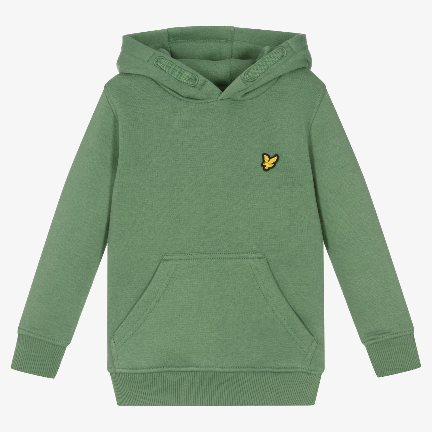 Green hoodie for boys by Lyle & Scott, with the designer’s distinctive Golden Eagle logo on the chest. Made in a soft sweatshirt jersey blend, this cosy layer has a fleecy inside and a faux drawstring detail on the hood. The pouch pocket on the front is great for keeping hands warm.