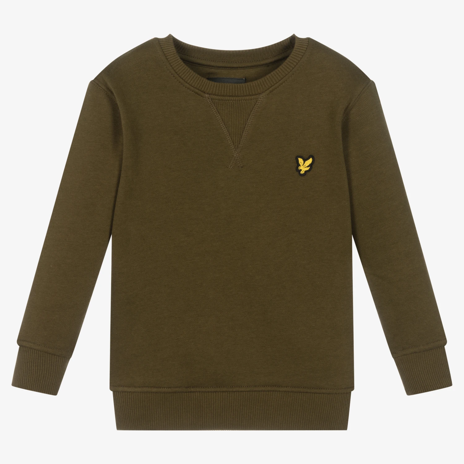 Cosy and comfy for boys, this dark olive green sweatshirt is by Lyle & Scott. It is made in soft mid-weight cotton jersey, with a warm fleecy inside. There are ribbed trims for a snug fit and an embroidered Eagle logo on the chest for brand recognition.