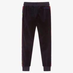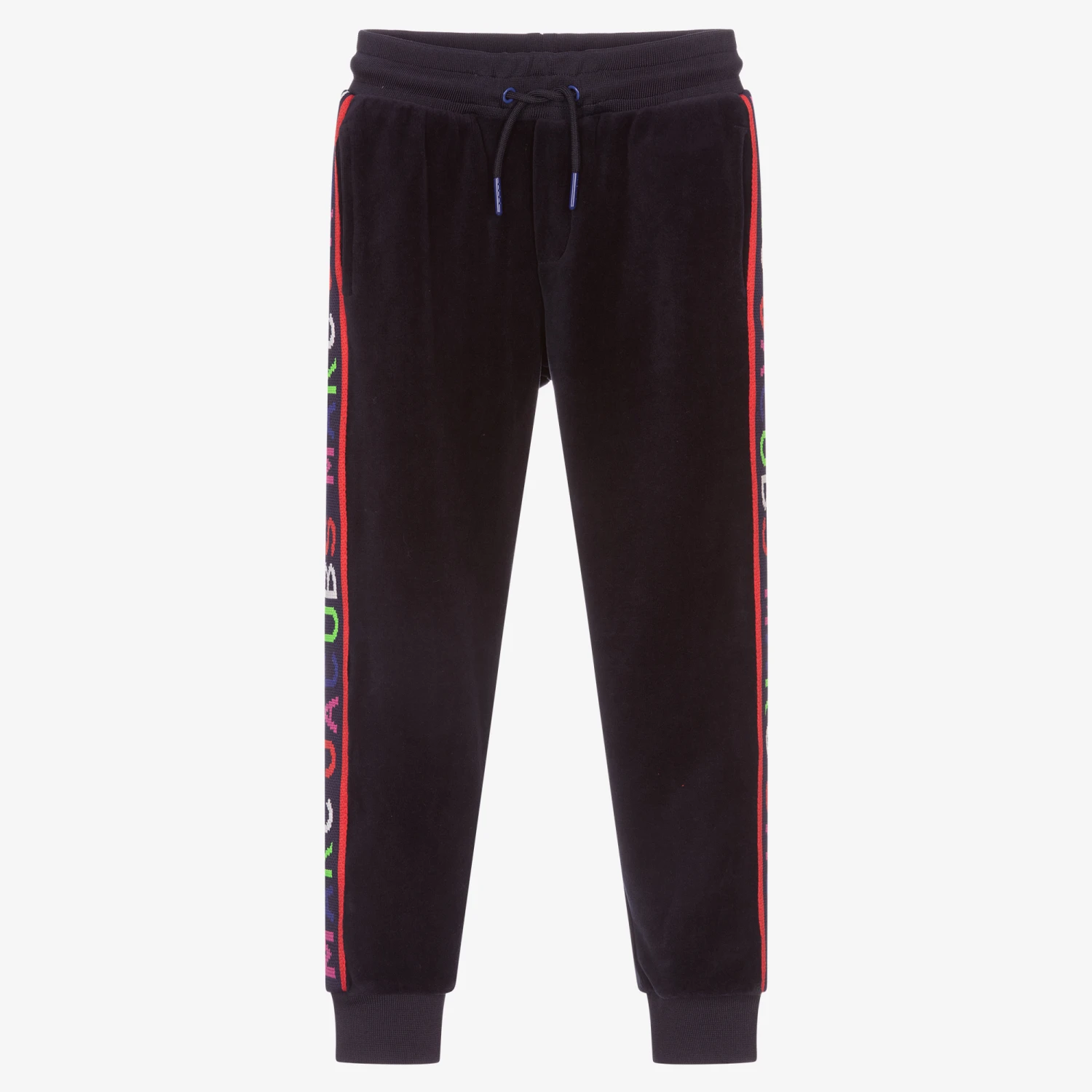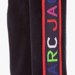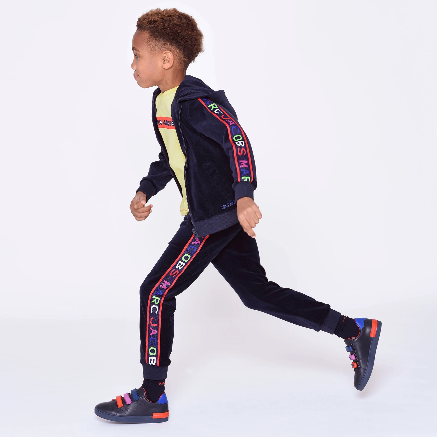Navy blue joggers for boys from MARC JACOBS, made in soft cotton velour. They have colourful logo jacquard trims and an embroidered logo on the back. The ribbed waistband has an adjustable drawstring tie and there are useful side pockets.