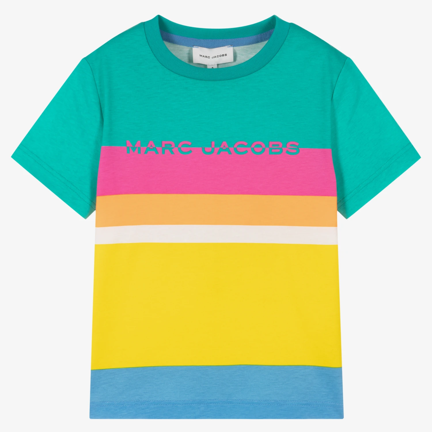 Eye-catching green cotton T-shirt for boys by American brand Marc Jacobs, with the designer’s logo across the front. Made in comfortable, stretchy jersey, it is striped in bold pink, neon orange, yellow and blue. This product contains cotton from organic farming.