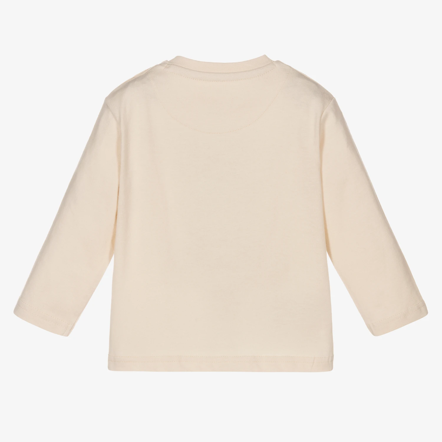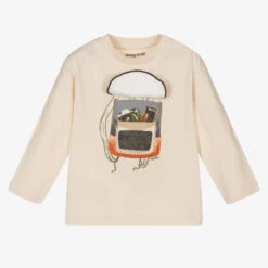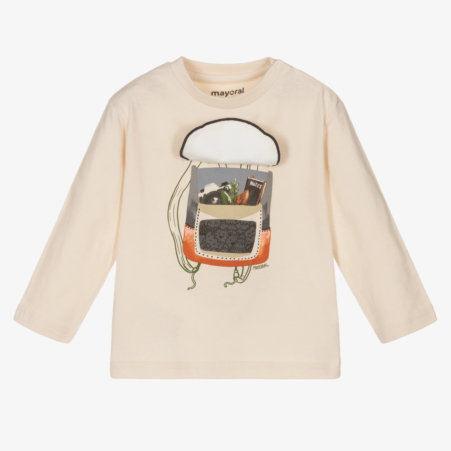 Little boys beige sustainable cotton top from Mayoral. Made in very soft, stretchy brushed jersey, this long-sleeved top has a fun interactive fox backpack motif with a camera and notebook print beneath the soft fabric flap. There are popper fastenings on one shoulder for ease when dressing.