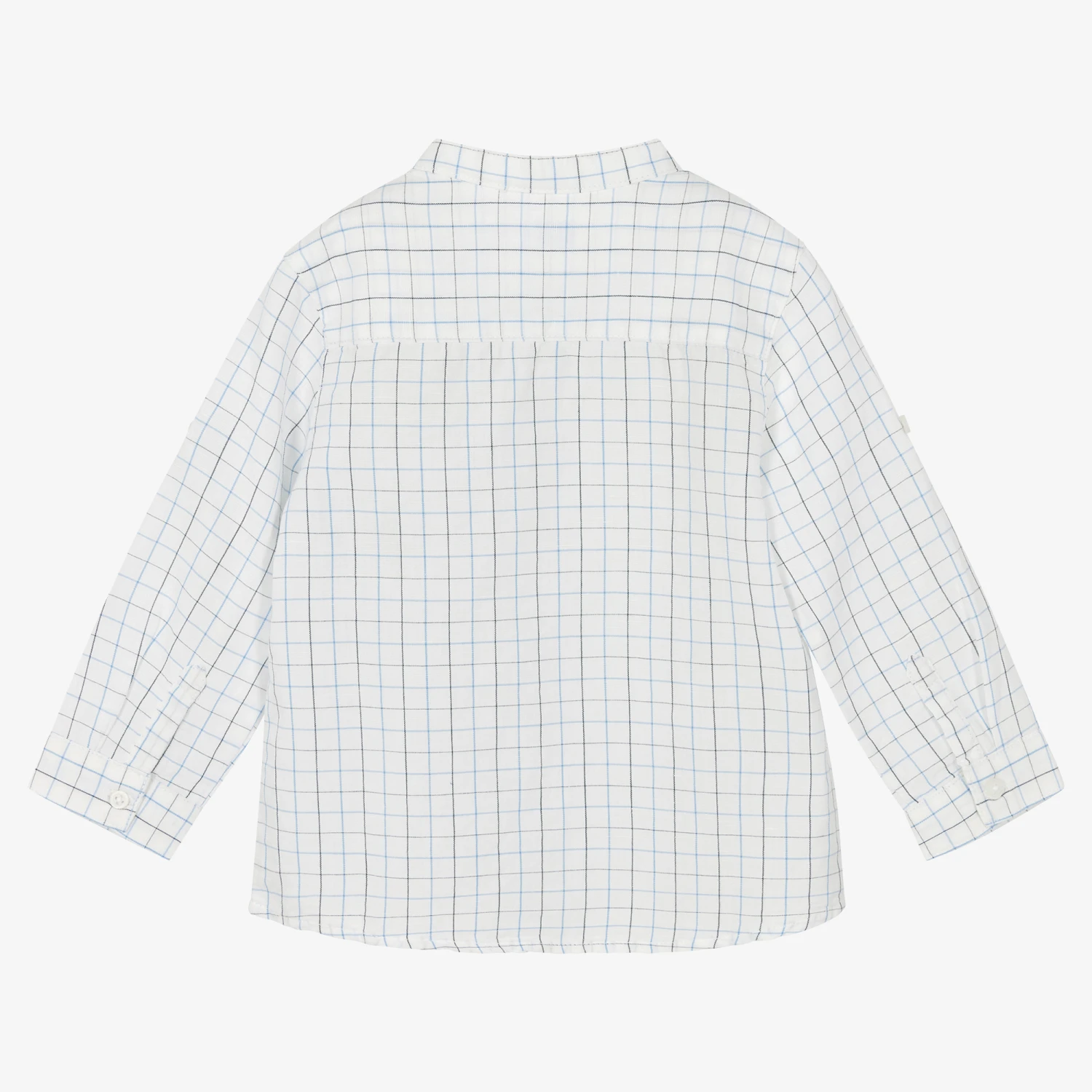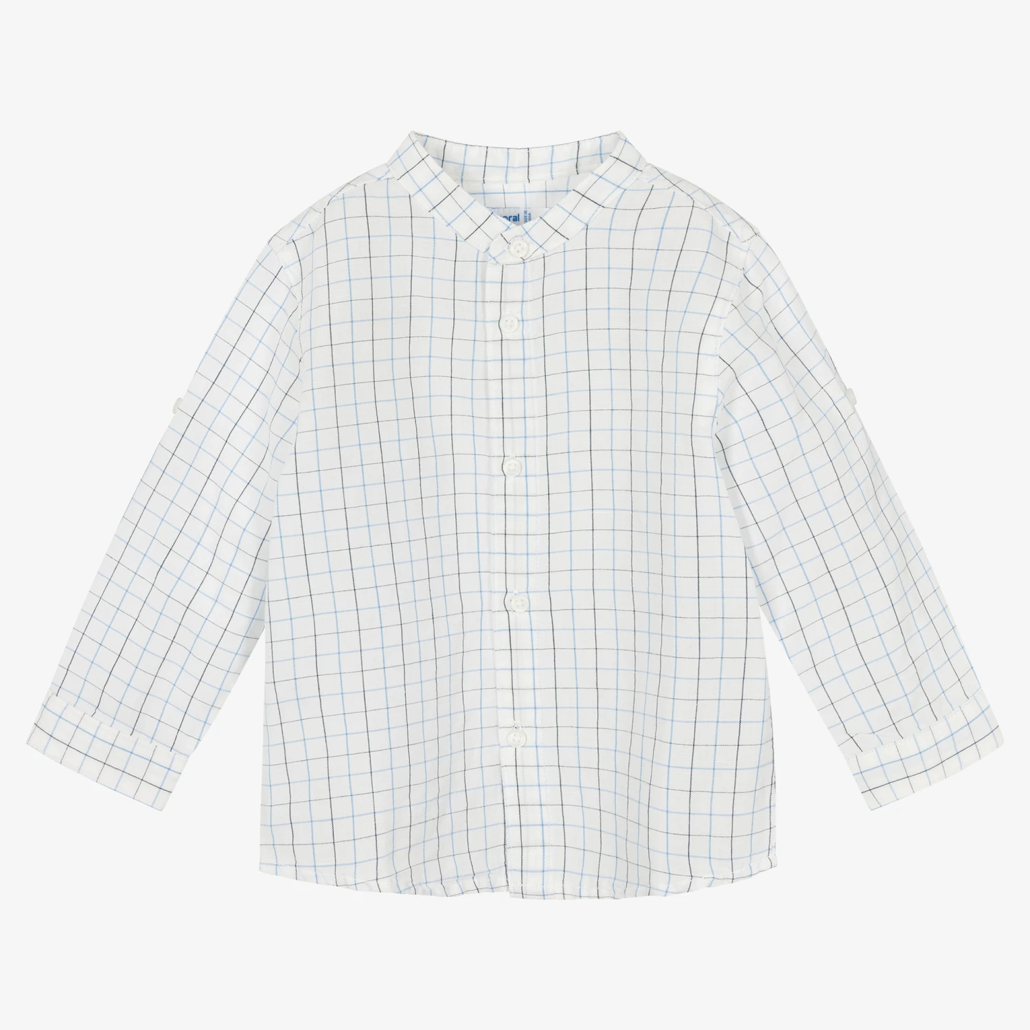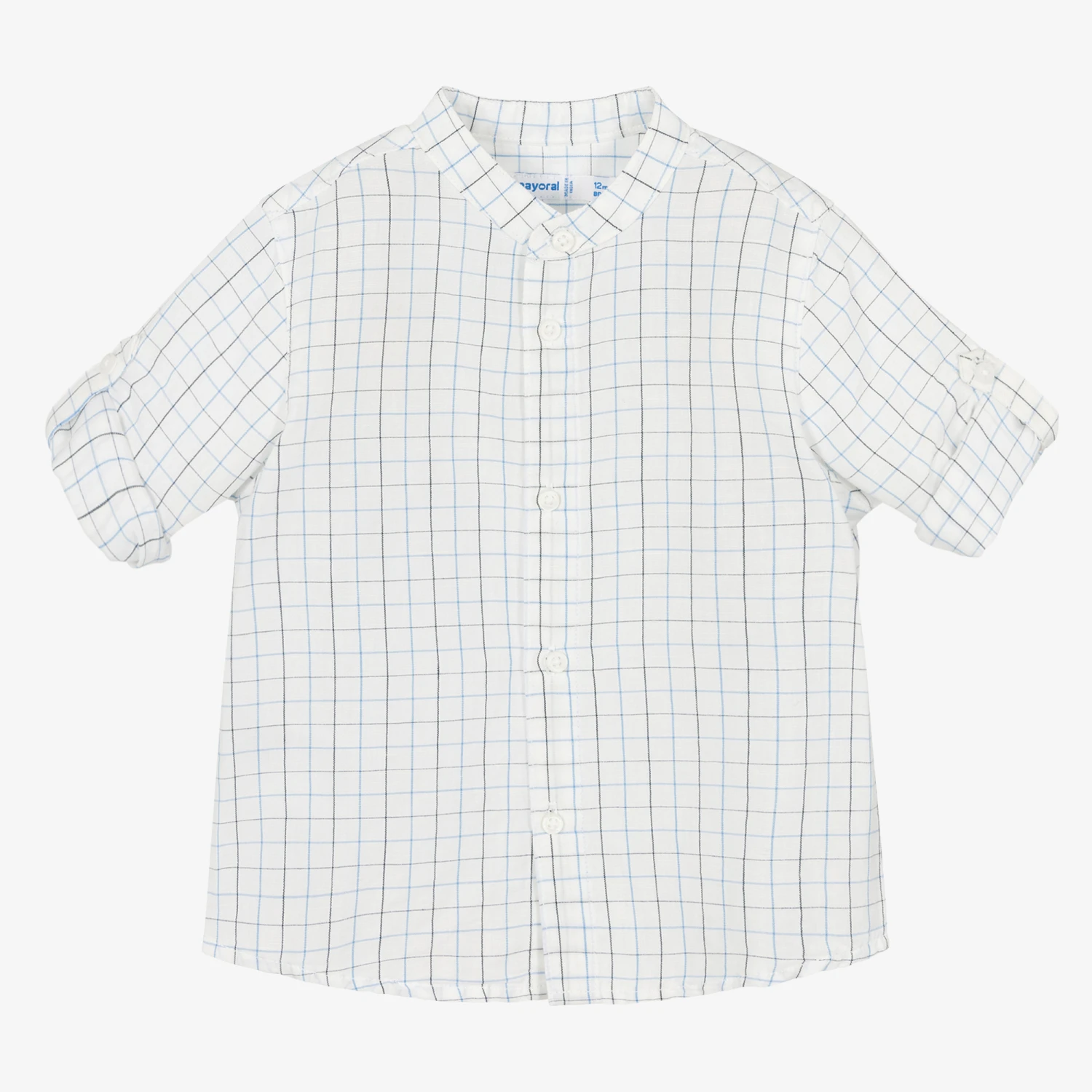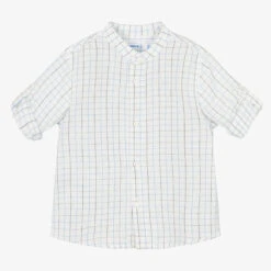 Casual white shirt for little boys by Spanish brand Mayoral, made in a comfortable lightweight cotton and linen blend. Collarless, it is checked in shades of blue and has tabs on the sleeves to roll up and secure the cuffs. It fastens with little white buttons on the front and sleeves.