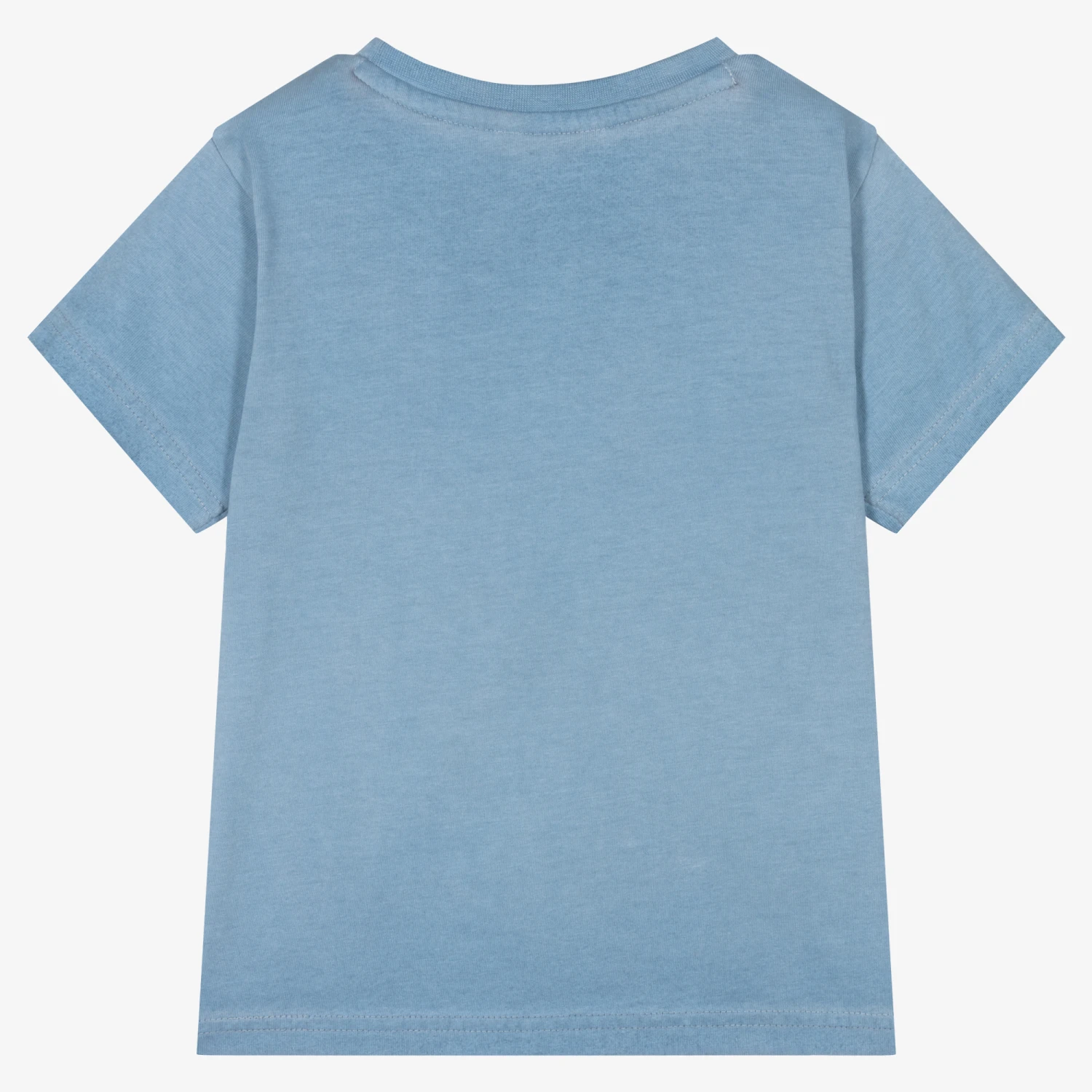Blue T-shirt for boys by Mayoral, made in soft and stretchy sustainable cotton jersey. Comfortable and easy to wear, it has a black and grey elephant and rhino on the front and the words ‘Explore New Adventures’ on the chest.