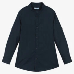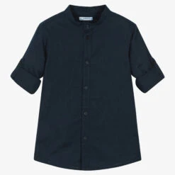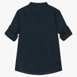Navy blue shirt for boys by Mayoral, woven in a soft cotton and linen blend. In a stylish collarless design, it will be a great addition to his smart-casual wardrobe. There are branded buttons down the front, with button tabs on the sleeves to secure them when turned up. The brand’s logo name is embroidered on the button placket for a subtle designer finish.