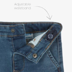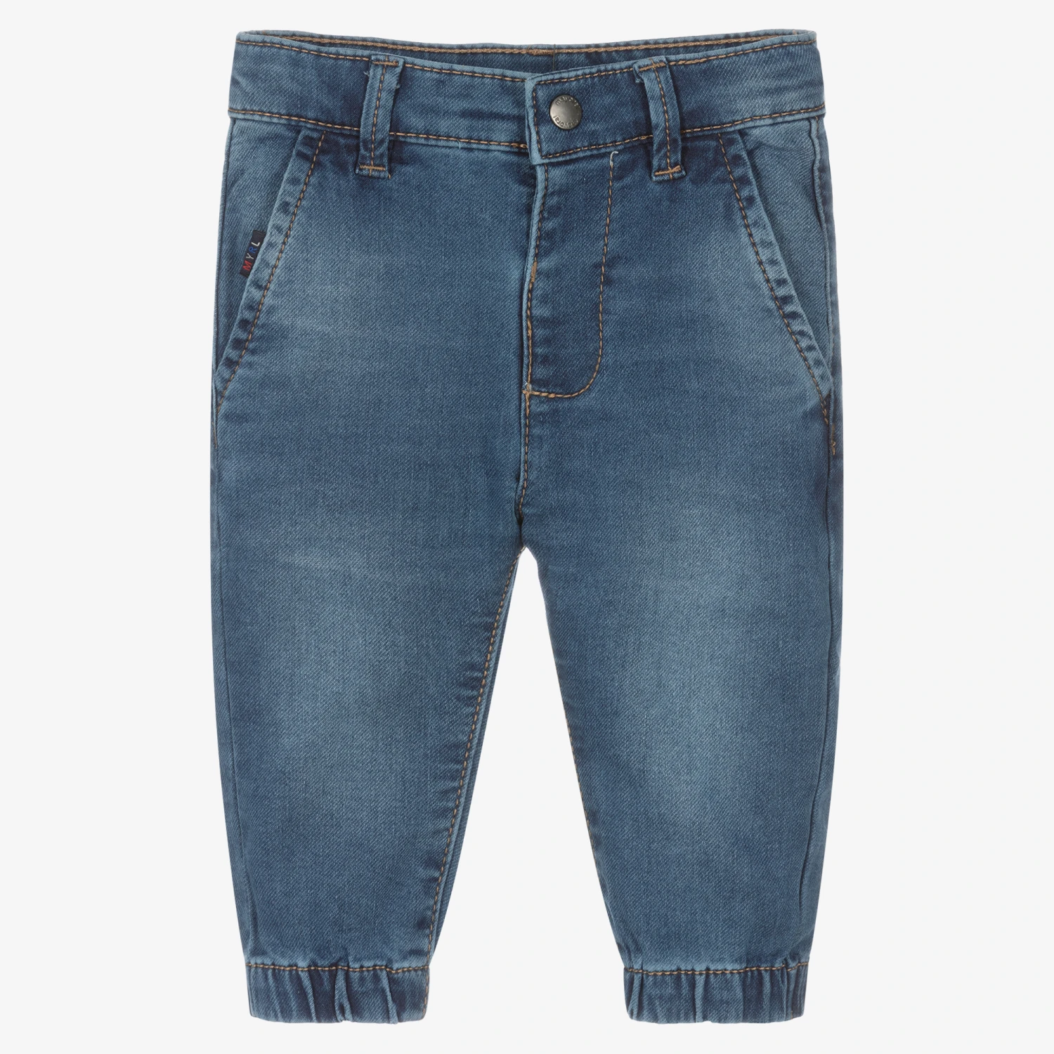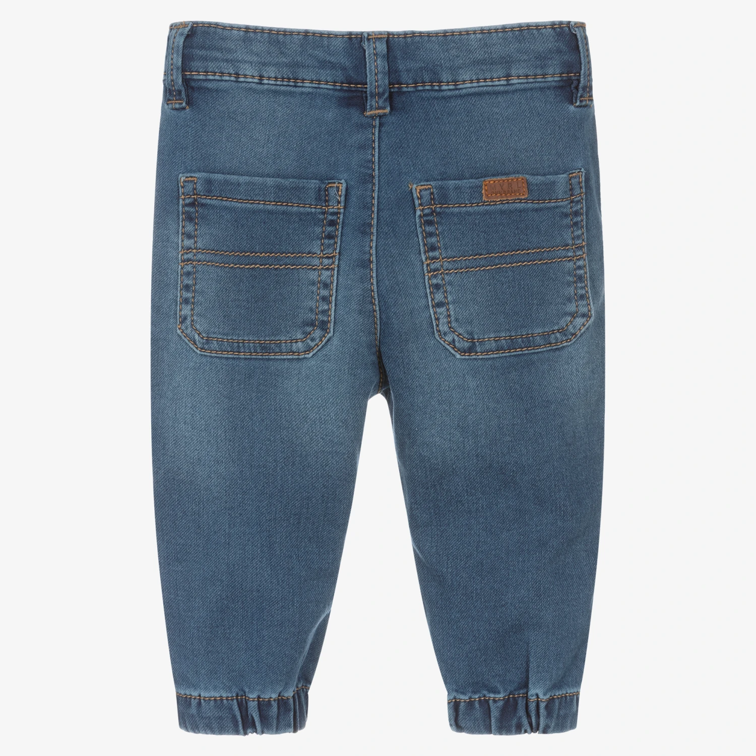 Blue washed jeans for little boys by Mayoral. Made from sustainable cotton, they have the look of denim with the comfort of jersey. The waistband is adjustable for a good fit and fastens easily with a popper. There are four pockets and gently elasticated ankle cuffs.