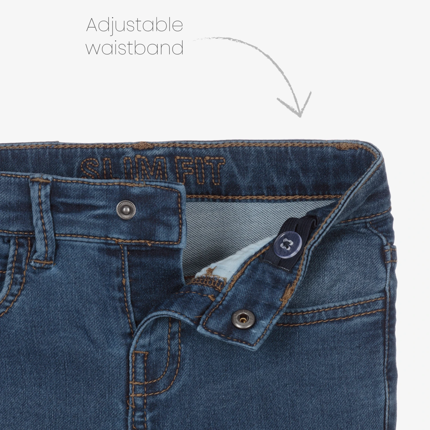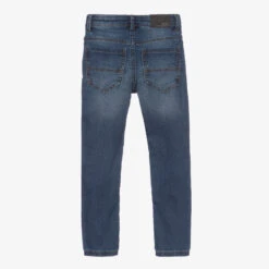 Blue slim fit denim jeans for boys by Mayoral, with a washed and worn look. Made in a soft cotton blend, they have classic five-pocket styling with a useful adjustable waistband. They fasten with a popper and have a fabric tab on the coin pocket with a faux leather logo tab sewn around the back. This garment is made with sustainable cotton, reducing its impact on the environment.