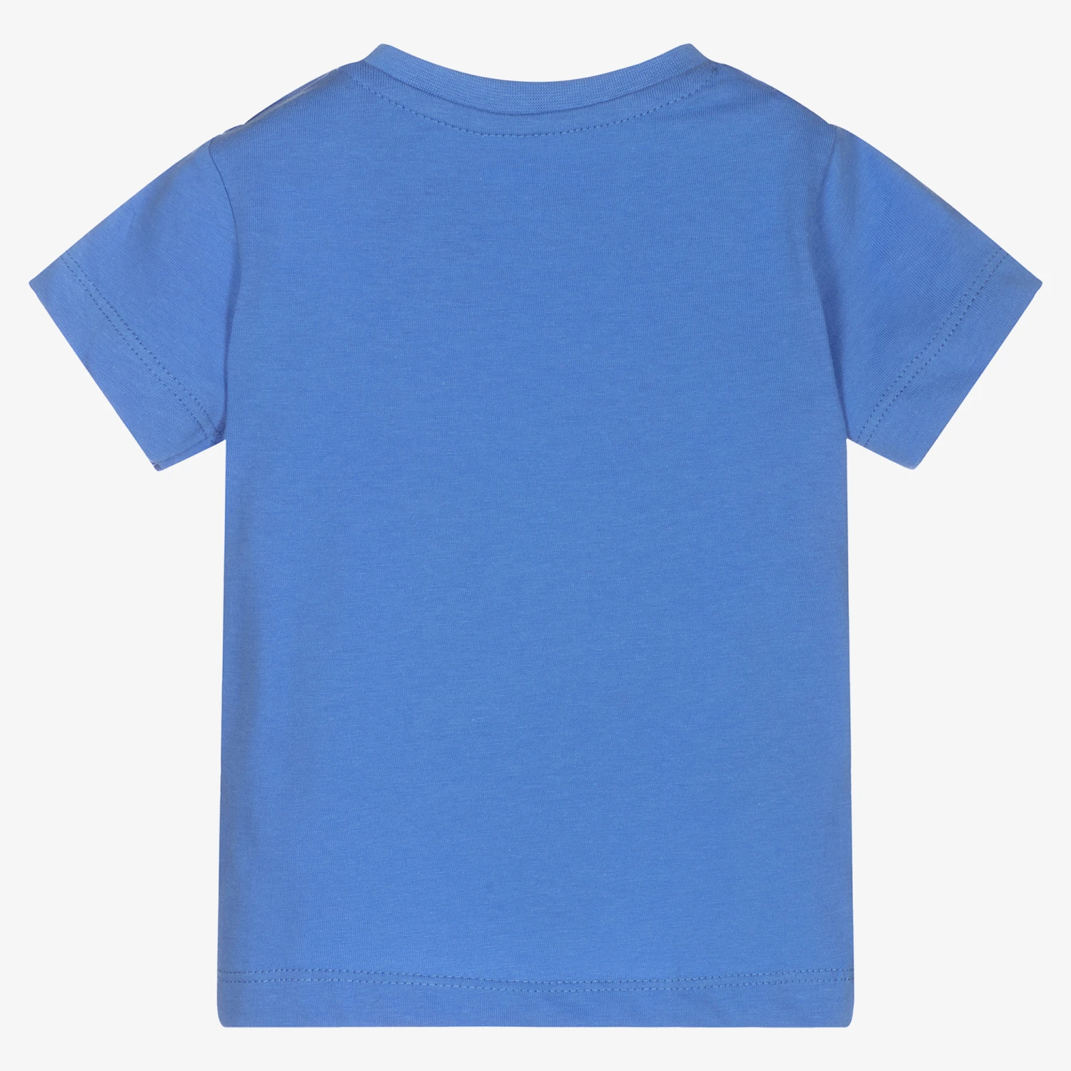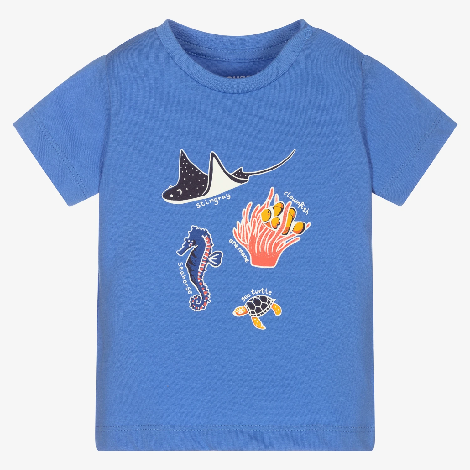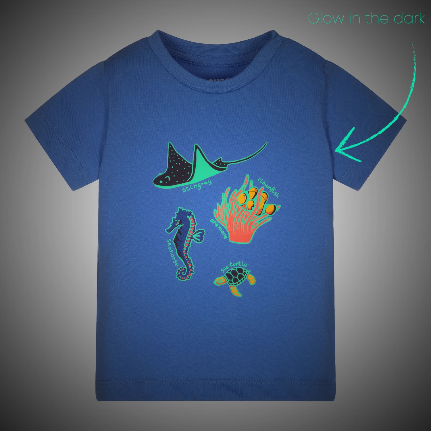 Blue T-shirt for little boys by Mayoral, made in soft sustainable cotton jersey. It has a fun glow-in-the-dark sealife print in navy blue and coral orange on the front. There are useful popper fastenings on the shoulder.