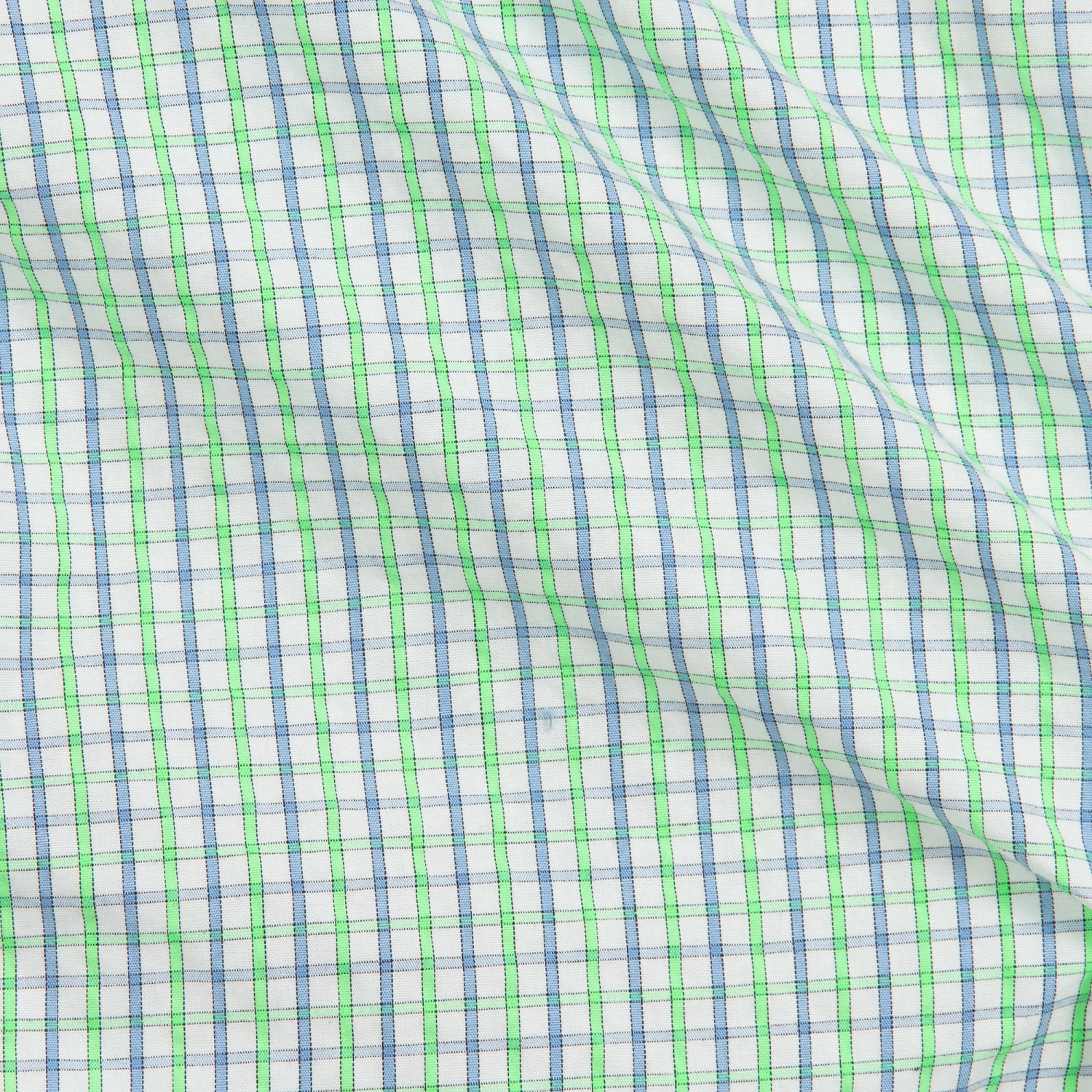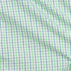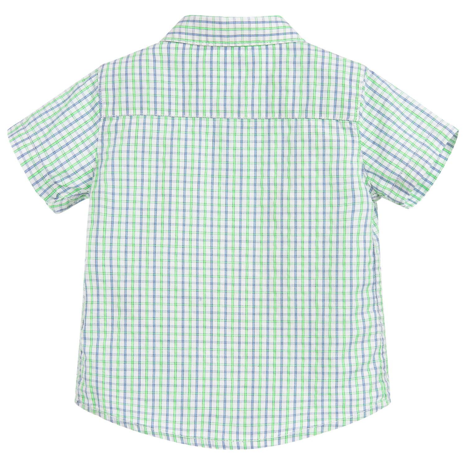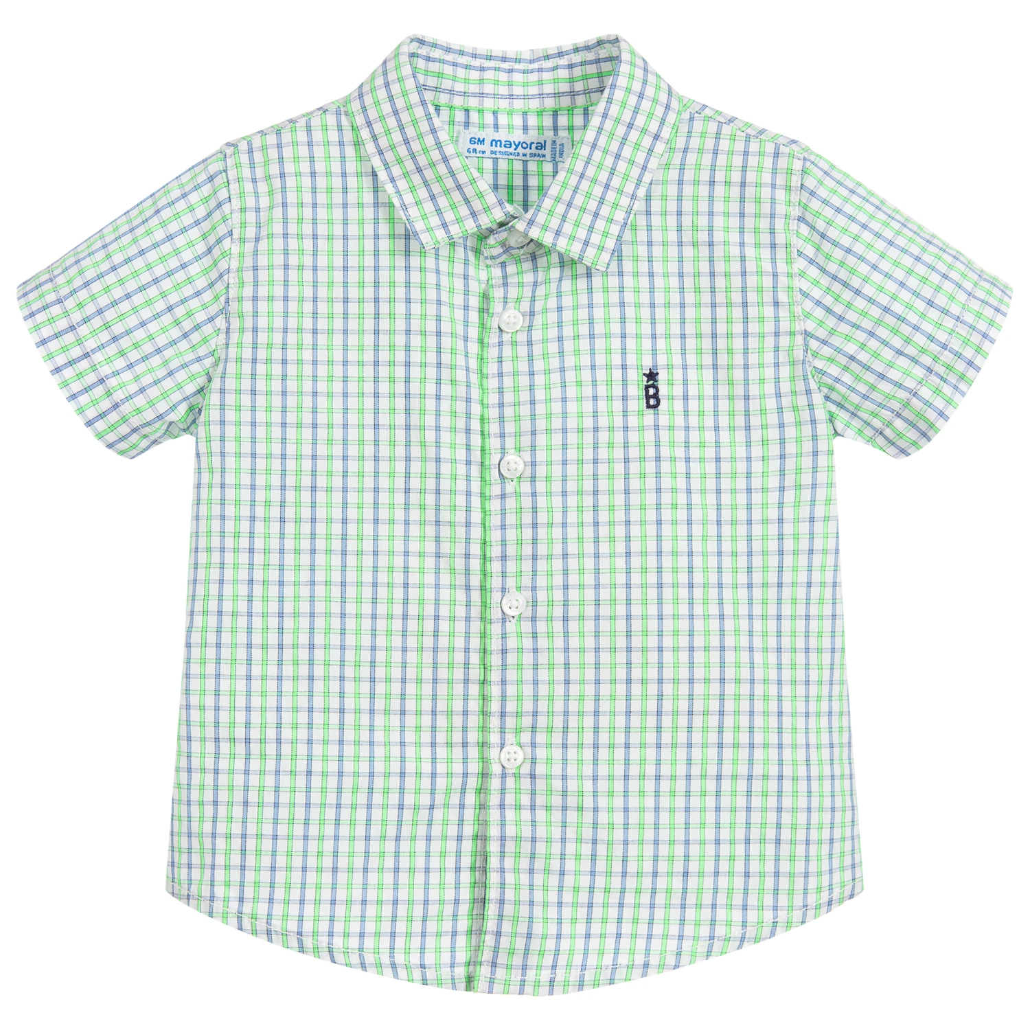 Younger boys short-sleeved cotton shirt by Mayoral, with a green and blue checked print on a white background.