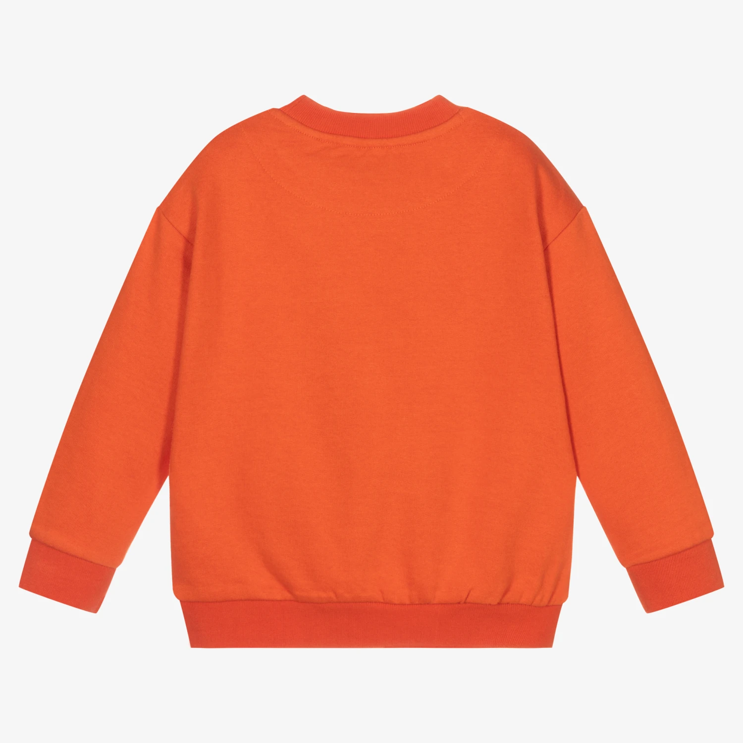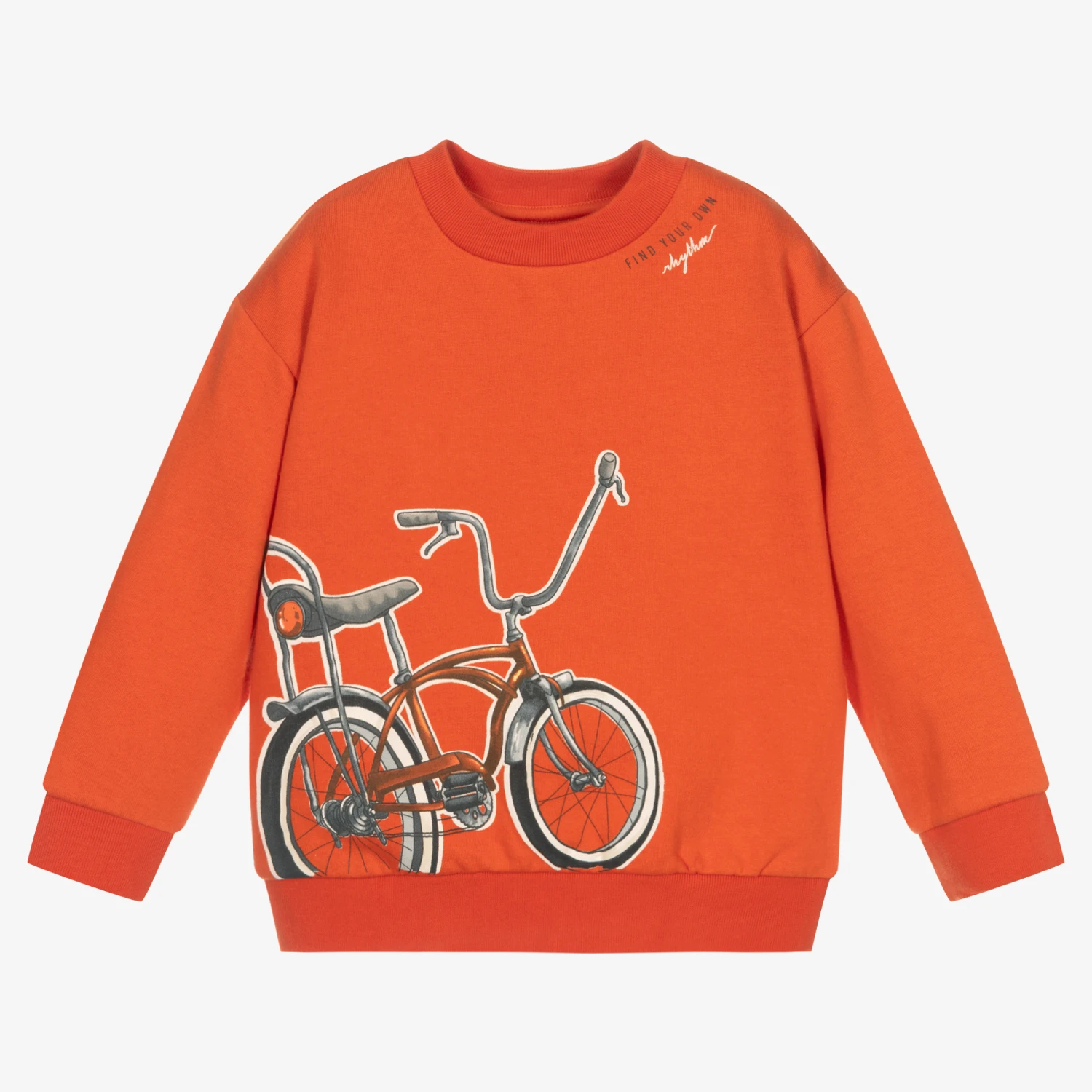 Orange sweatshirt for boys by Mayoral, made in cotton jersey with a soft brushed feel inside. It has a retro chopper bicycle print in grey and orange on the front and ‘Find your own rhythm’ printed on the neckline. It is made using sustainable cotton.