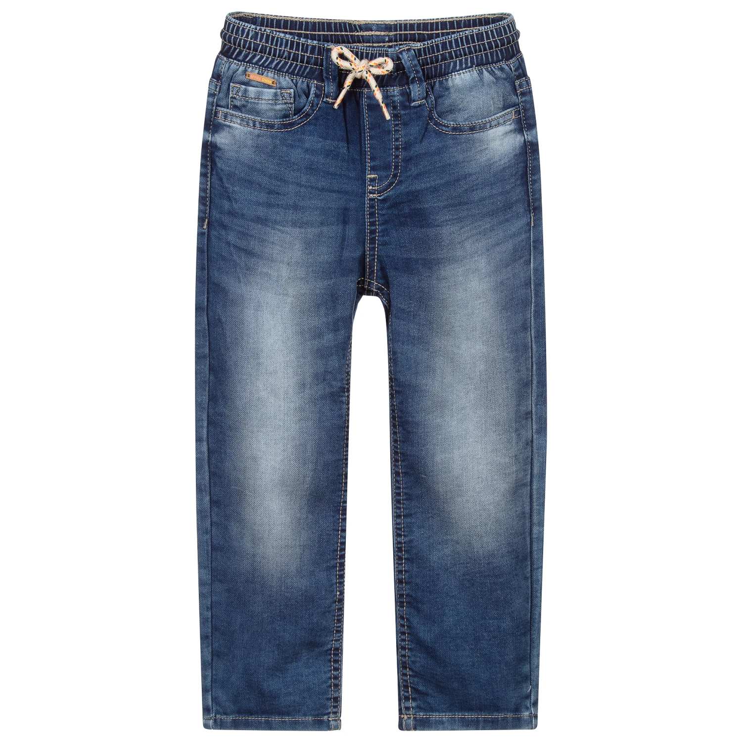 Mid-blue jeans for boys by Mayoral, made in soft, stretch denim, with faded patches on the front and back. With a jogger fit, they have the classic five pocket design and an elasticated, drawstring waist.