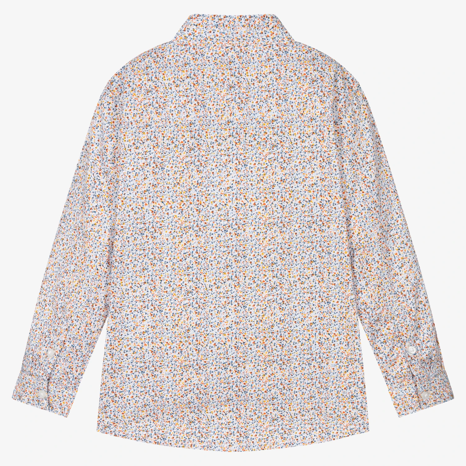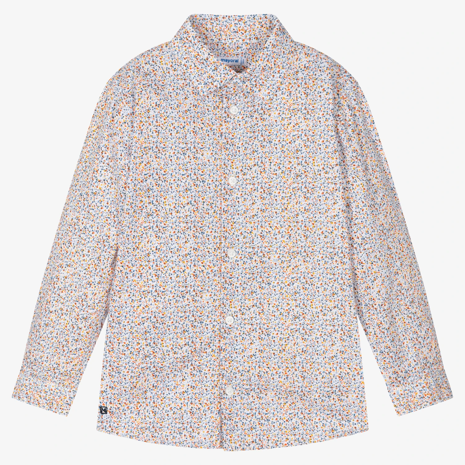 Lovely white smart-casual shirt for boys by Mayoral, with colourful orange, yellow and blue floral pattern. It is made in lightweight sustainable cotton and fastens with front buttons.