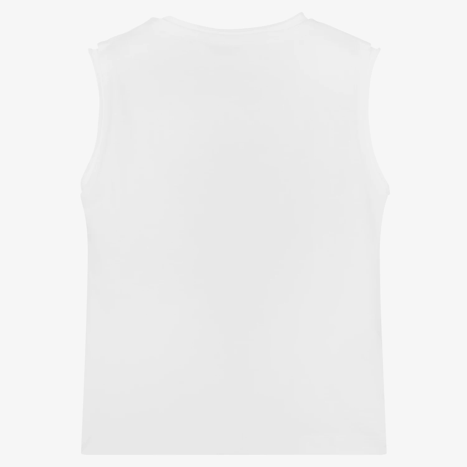 White cotton vest top for boys by Spanish brand Mayoral, with a print of a sunset on a beach in blue and yellow. Just right for relaxed days, it is made in stretchy jersey and has a rolled-up trim on the collar and cuffs, giving a casual, layered look.