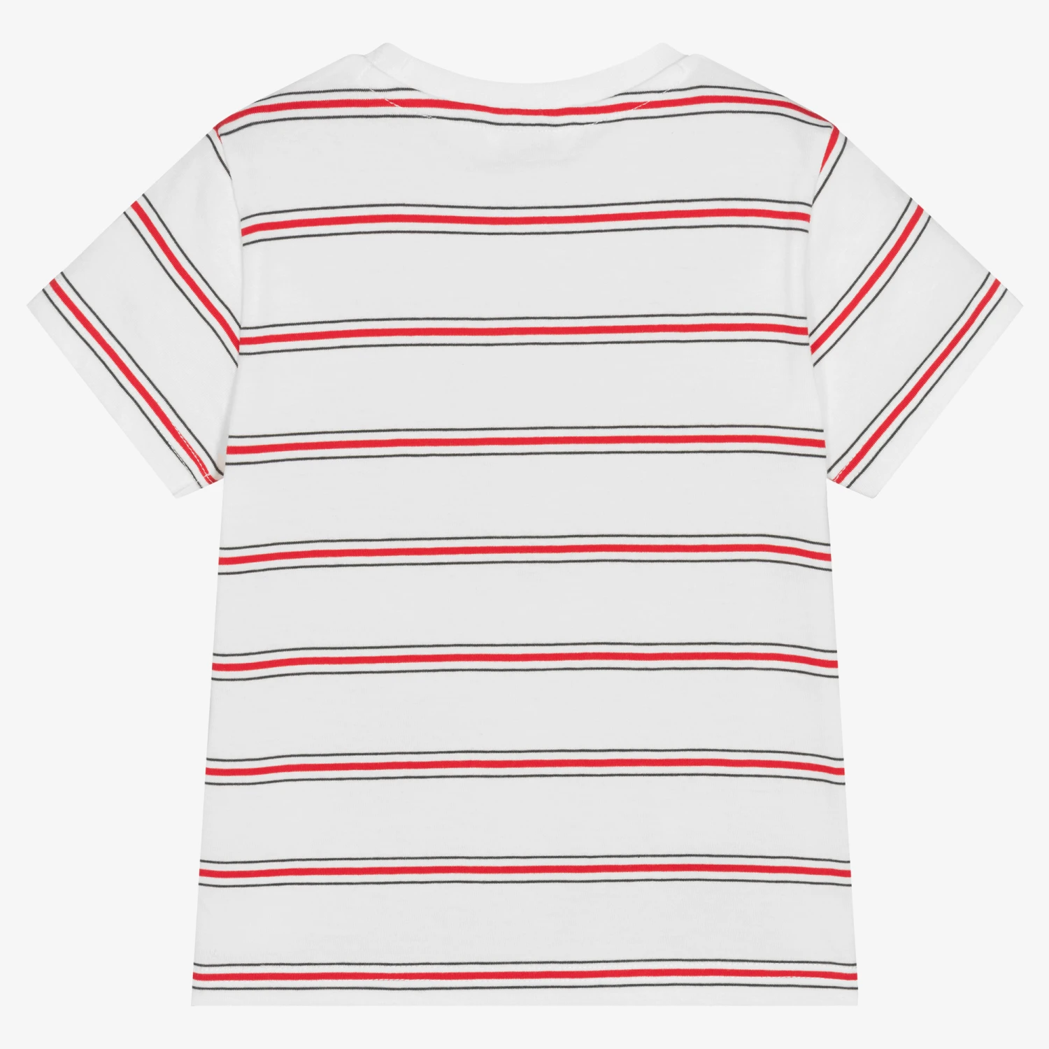 White sustainable cotton T-shirt for boys by Spanish brand Mayoral, striped in red and black. Made in comfortable jersey, it has adventure-themed dinosaur appliqués.