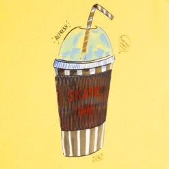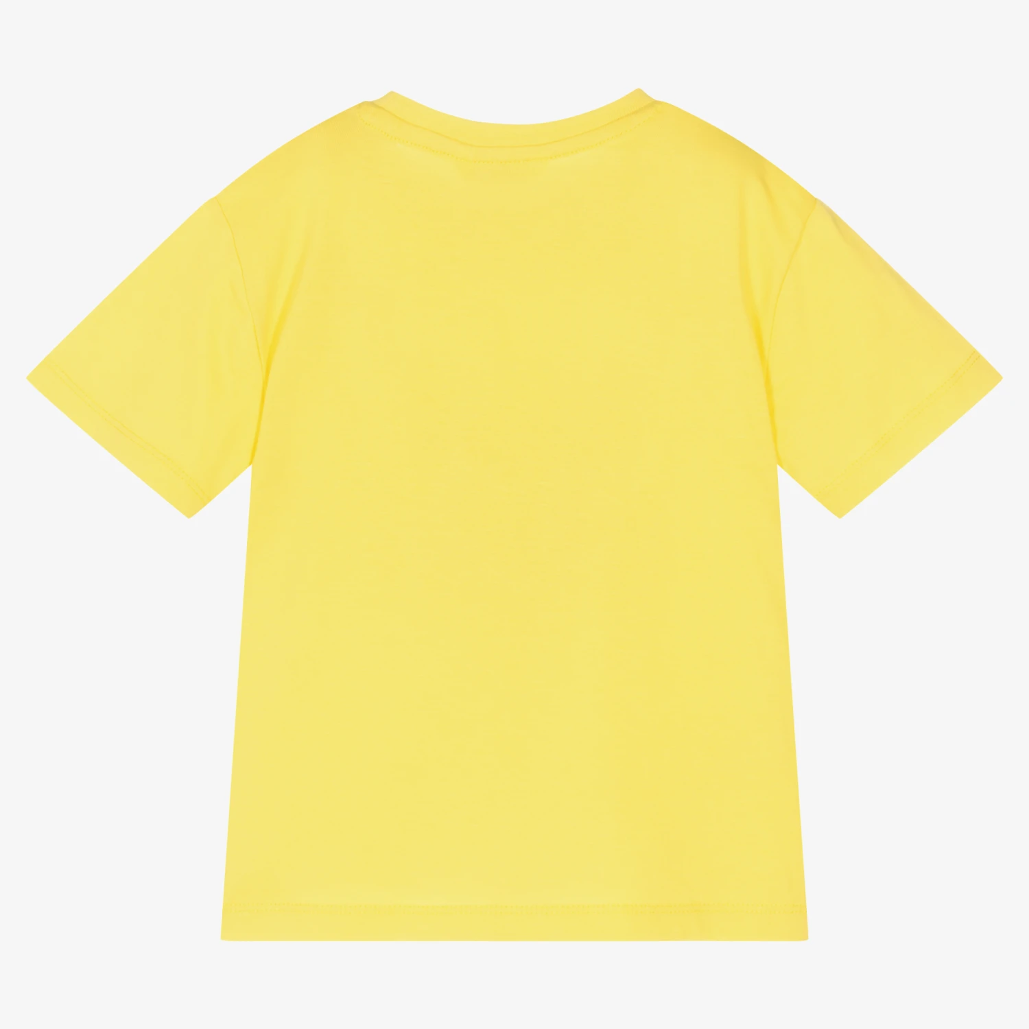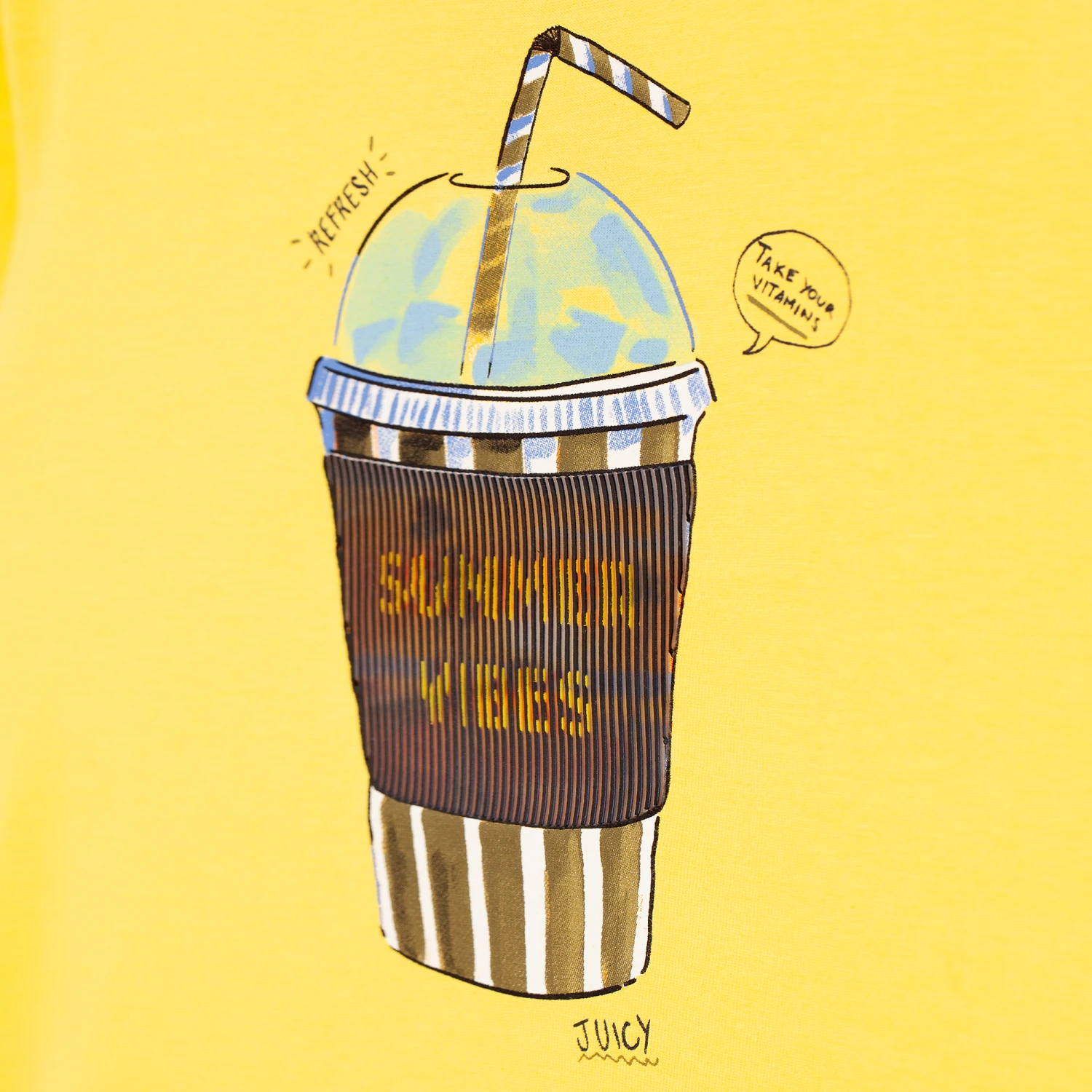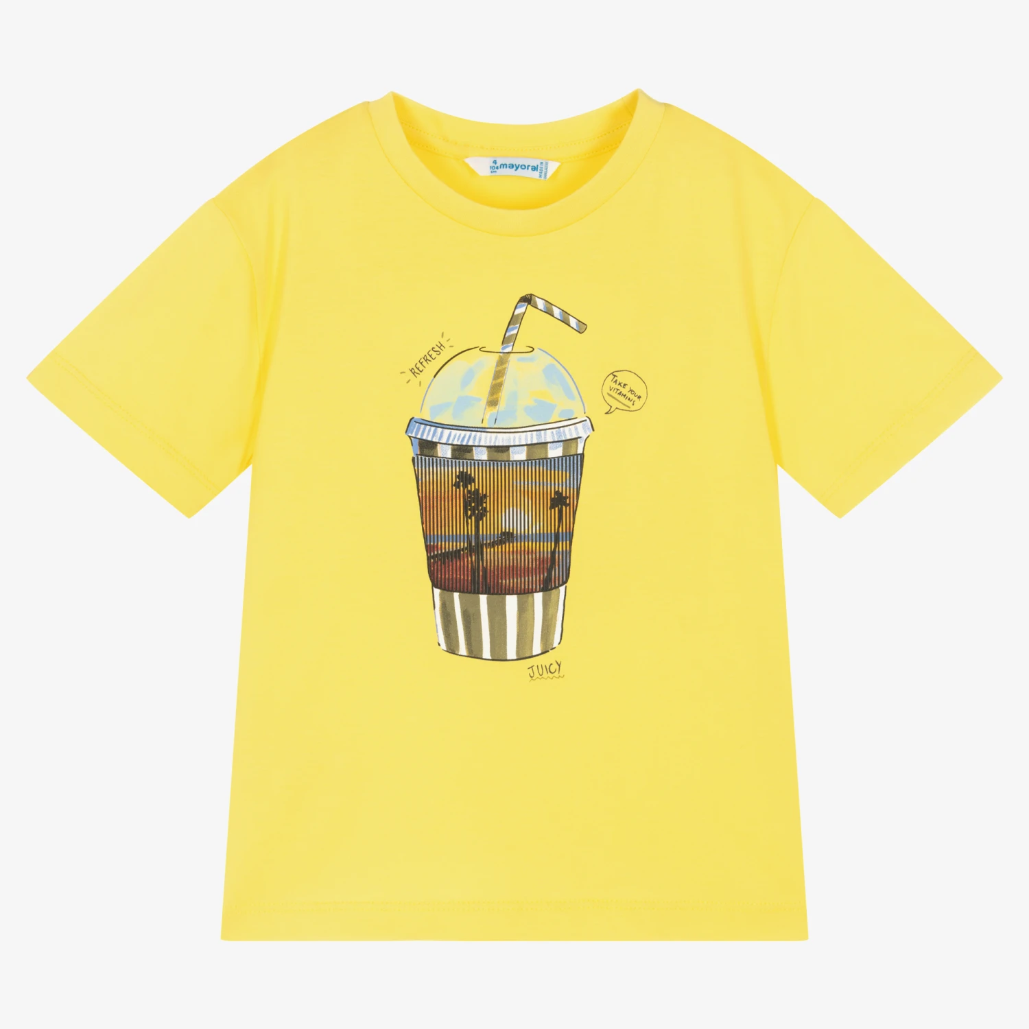 Yellow crew neck T-shirt for boys by Spanish brand Mayoral, made with sustainable cotton jersey. Soft and stretchy, the front is printed with a drinking cup and straw, with a sunset graphic. The cup has rubberised ribs, with hidden lenticular slogan prints for a touch of fun, and revealing the words ‘Summer Vibes’ and ‘Skate Time’.