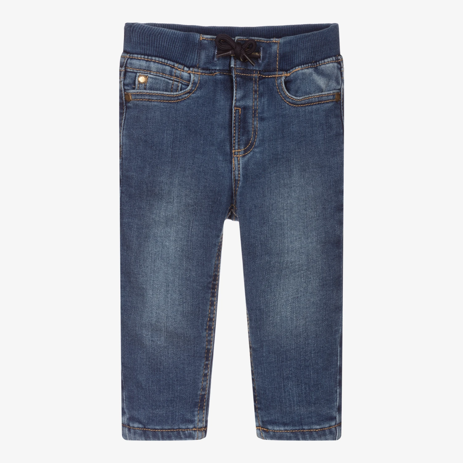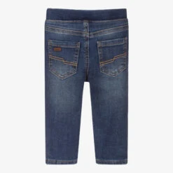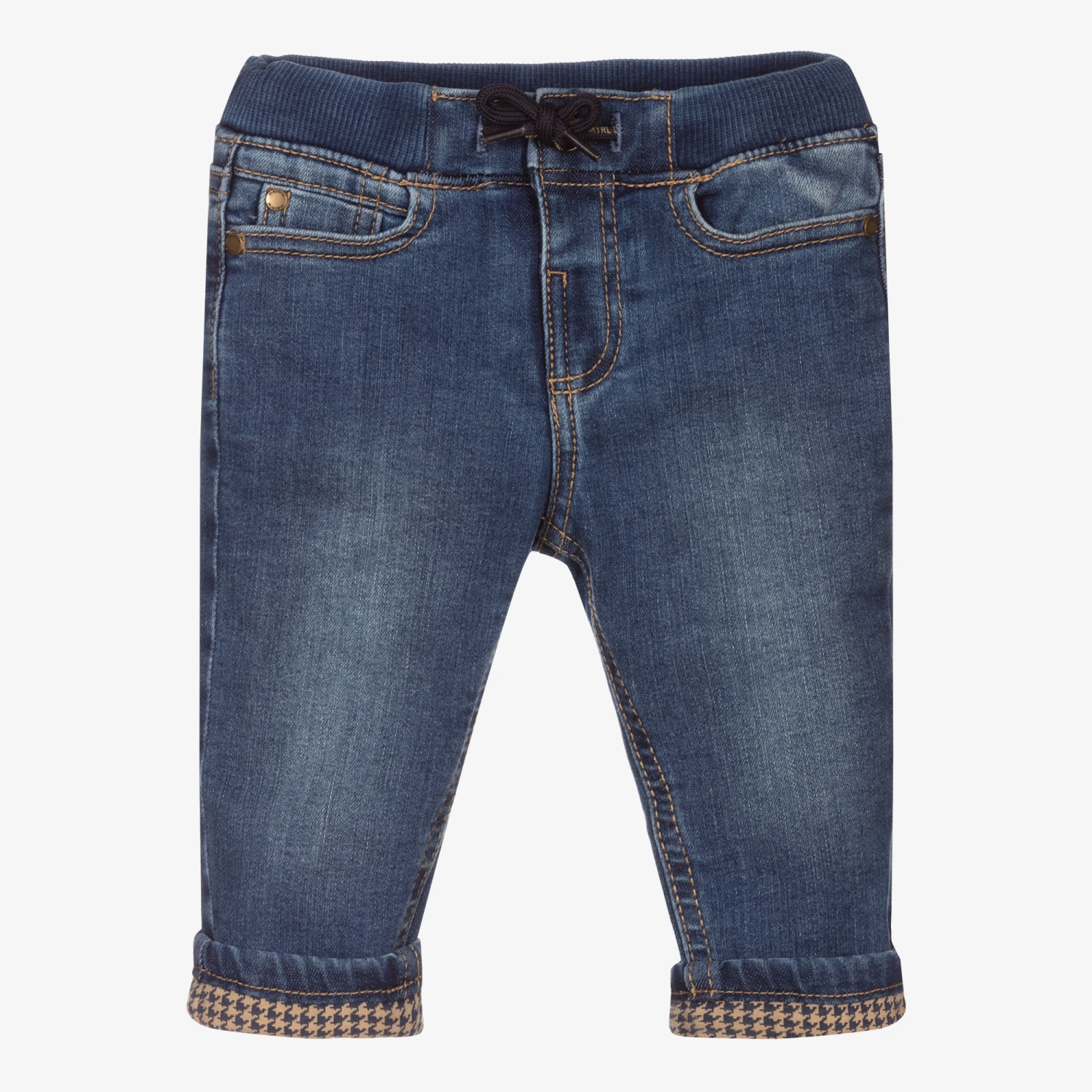 Mid-blue denim jeans for younger boys by Mayoral. Made in stretchy cotton blended with Repreve recycled polyester, they have a washed and worn look, with a beige and navy blue houndstooth jersey lining. The elasticated waistband has a useful navy blue and gold logo drawstring.