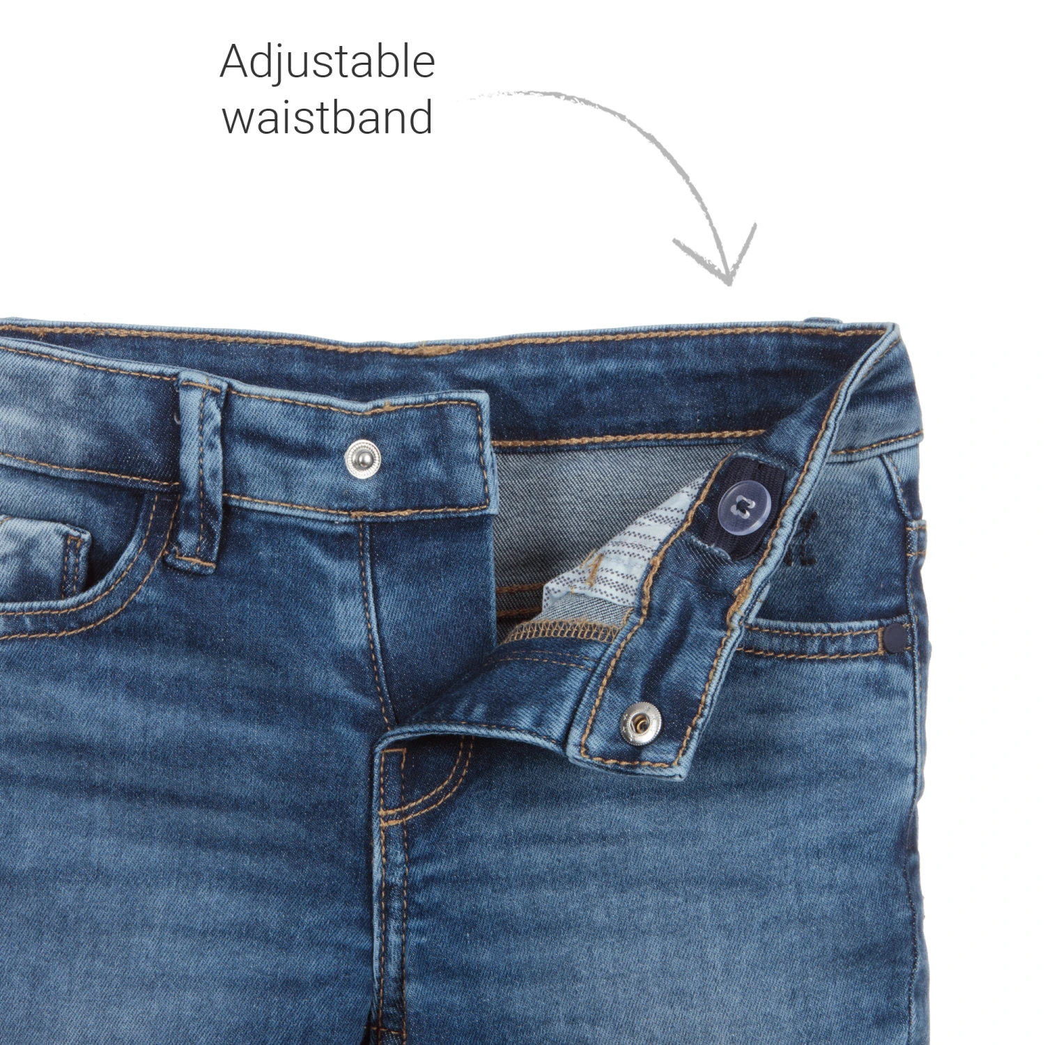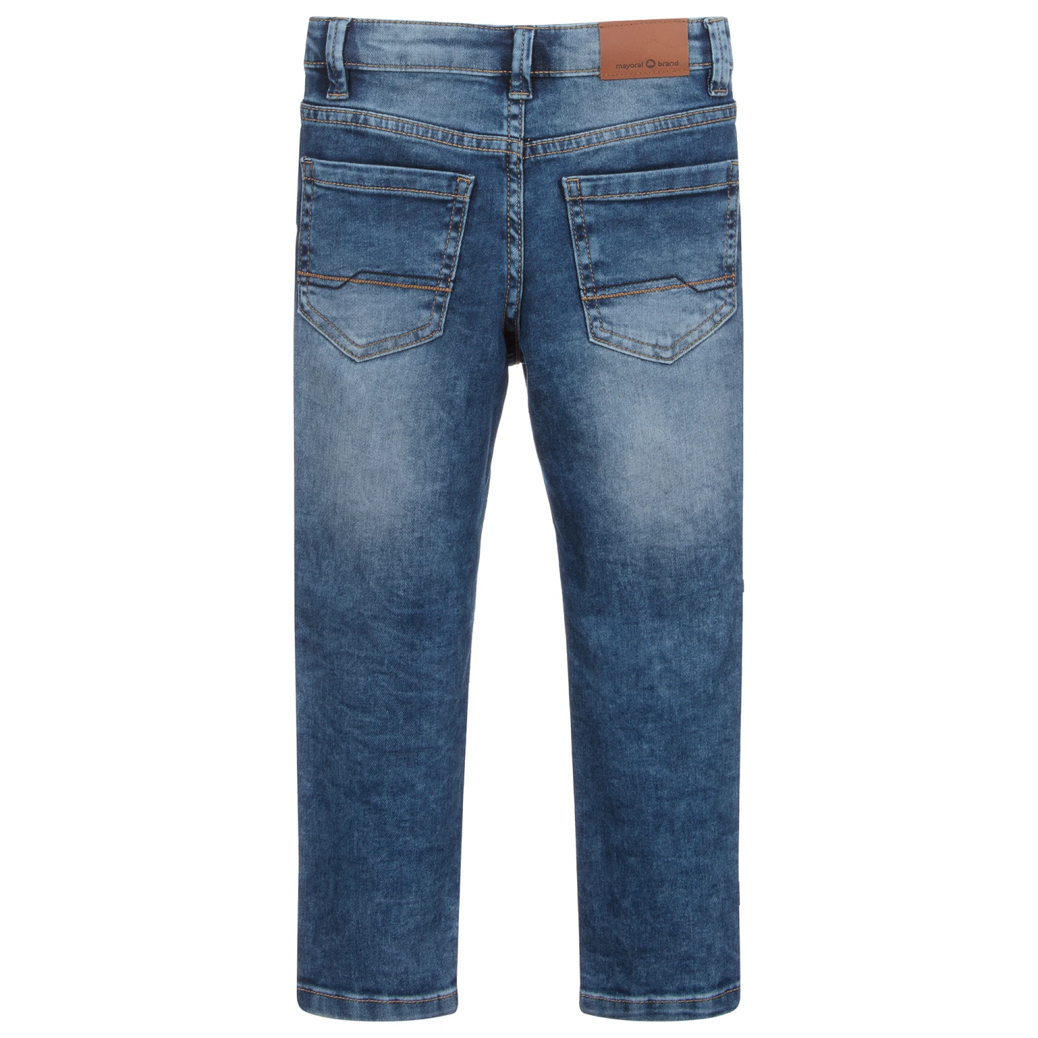 Mid-blue, slim fit jeans for boys by Mayoral, made in soft, stretch denim with faded areas on the front and back. They have classic five pocket styling, with a popper fastening and a useful, adjustable waist.