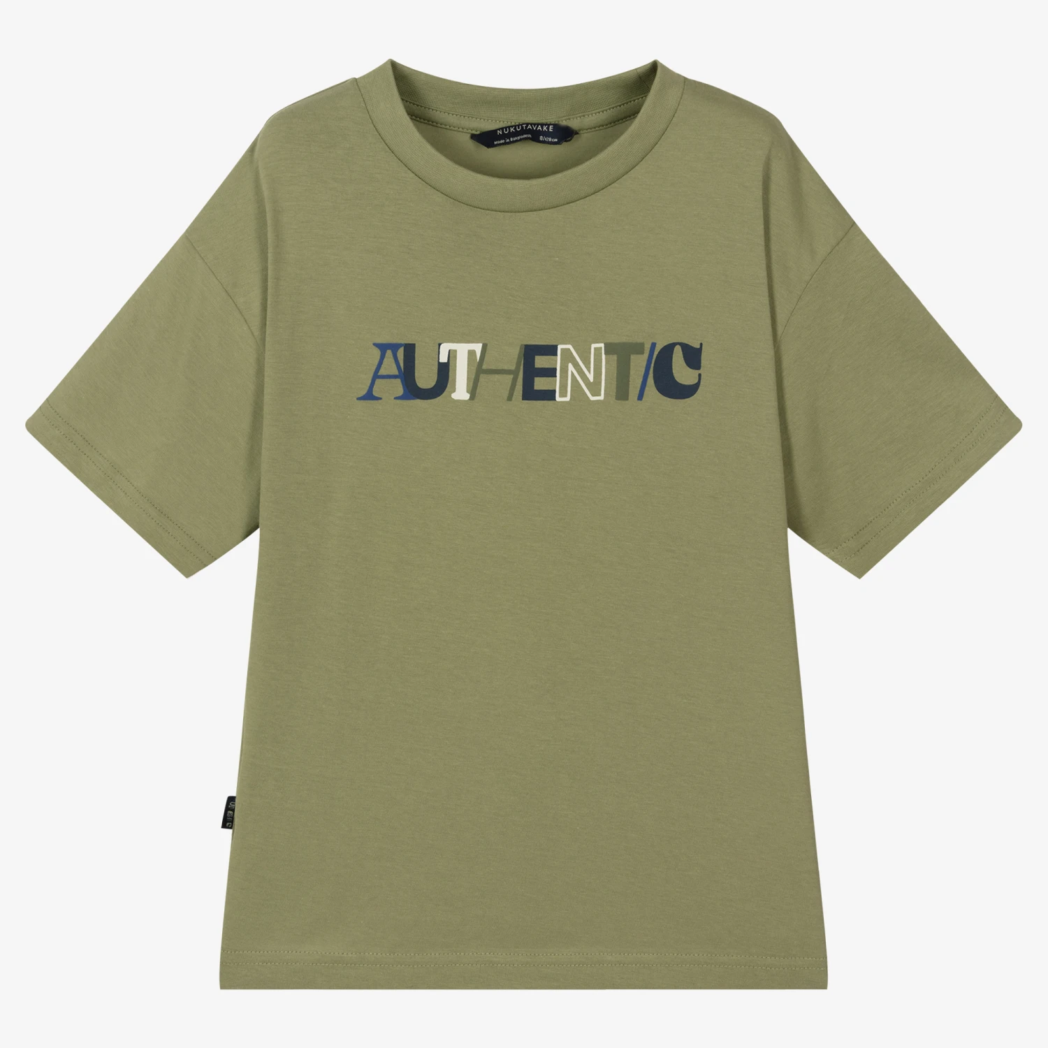 Khaki green T-shirt for older boys from Mayoral Nukutavake, made in soft sustainable cotton jersey. In an oversized fit, this cool, casual style features relaxed dropped shoulders and a blue and white ‘Authentic’ graphic across the front in different text styles.