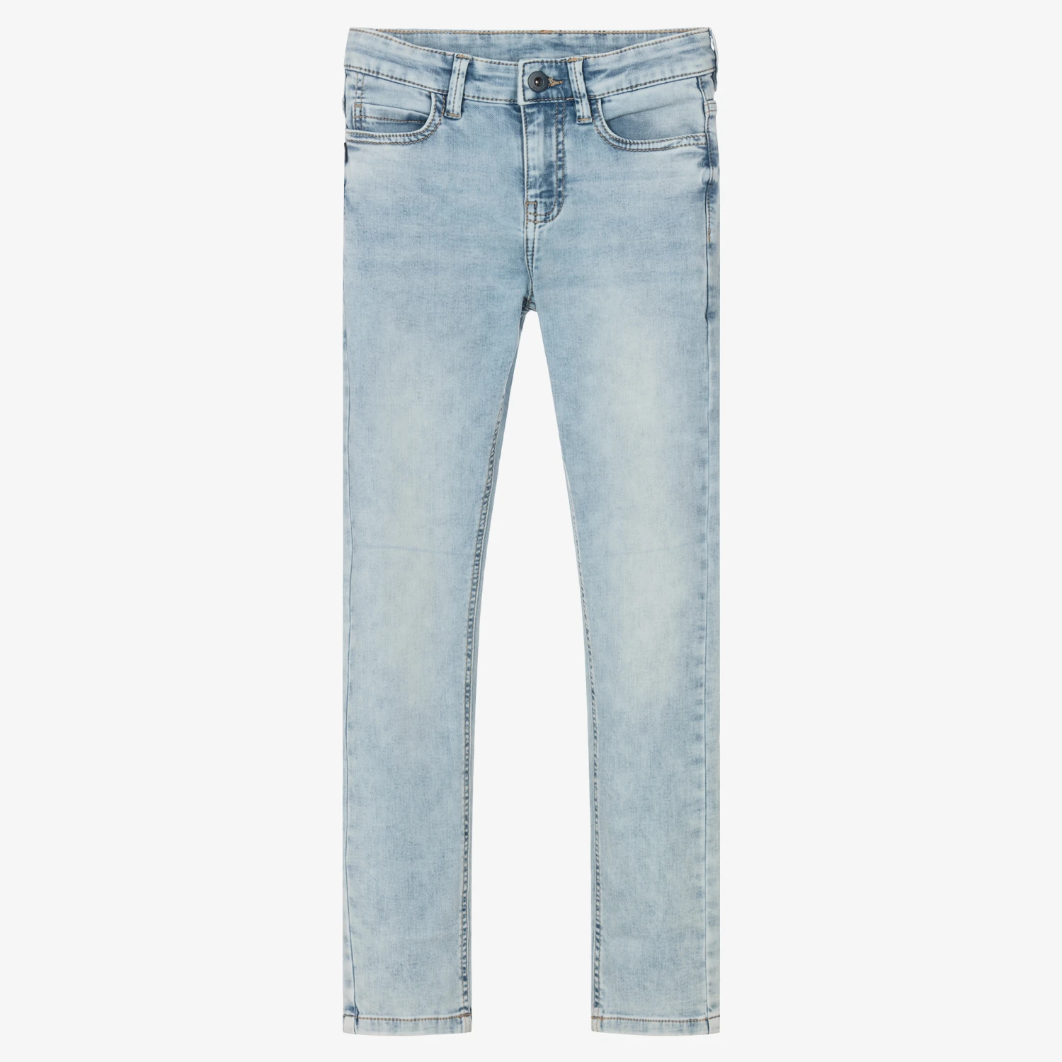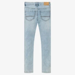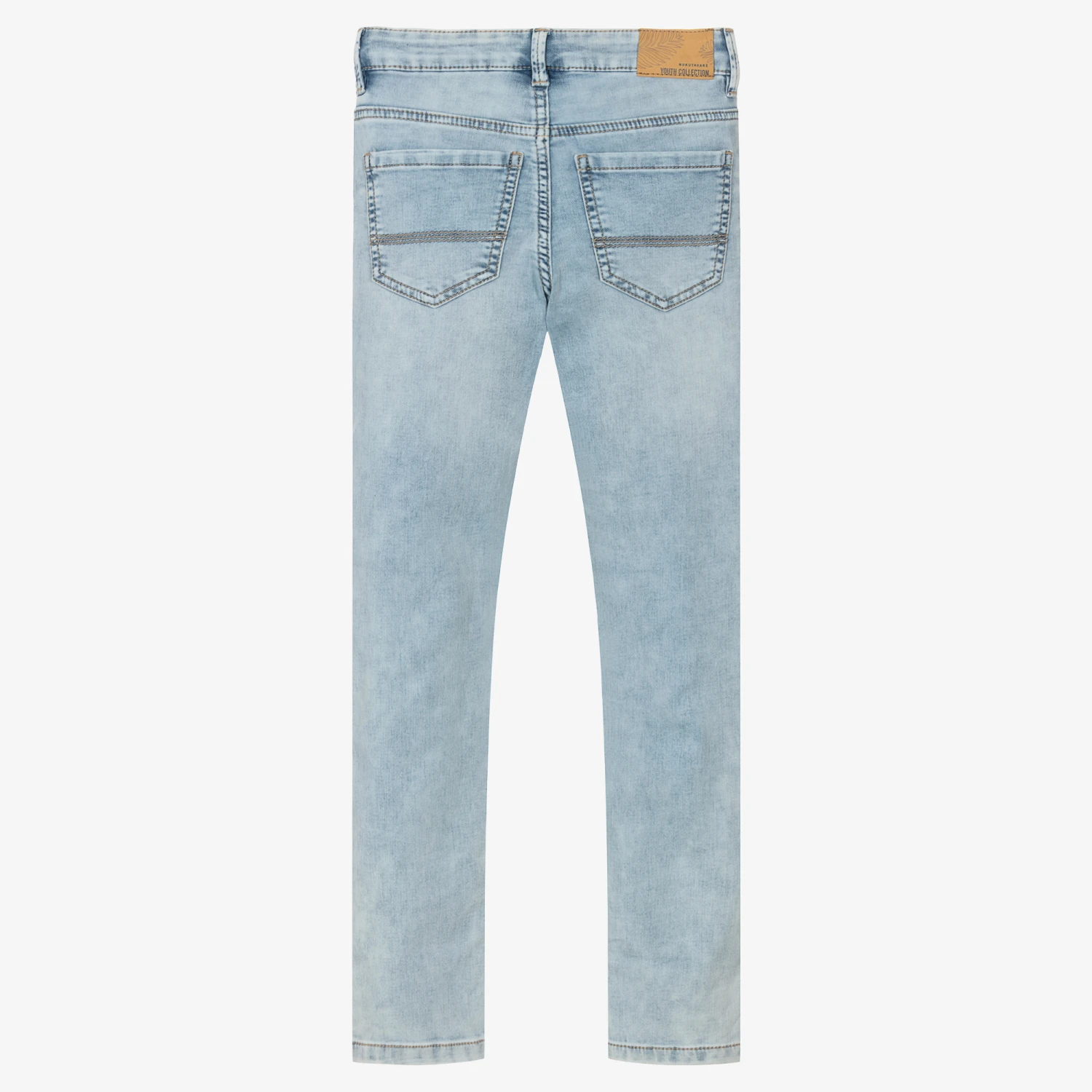 Boys light blue sustainable cotton denim jeans from Mayoral Nukutavake, in a stylish slim fit. Easy to pair with just about anything, these staple washed look jeans come in five pocket style and have a light tan brown logo patch on the back. An adjustable waist allows room to grow, whilst the zip and button fasten easily.