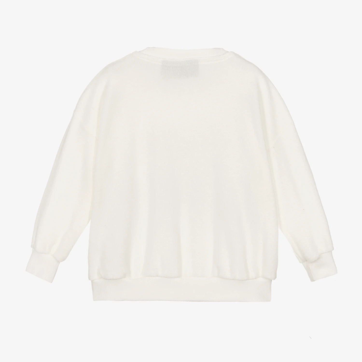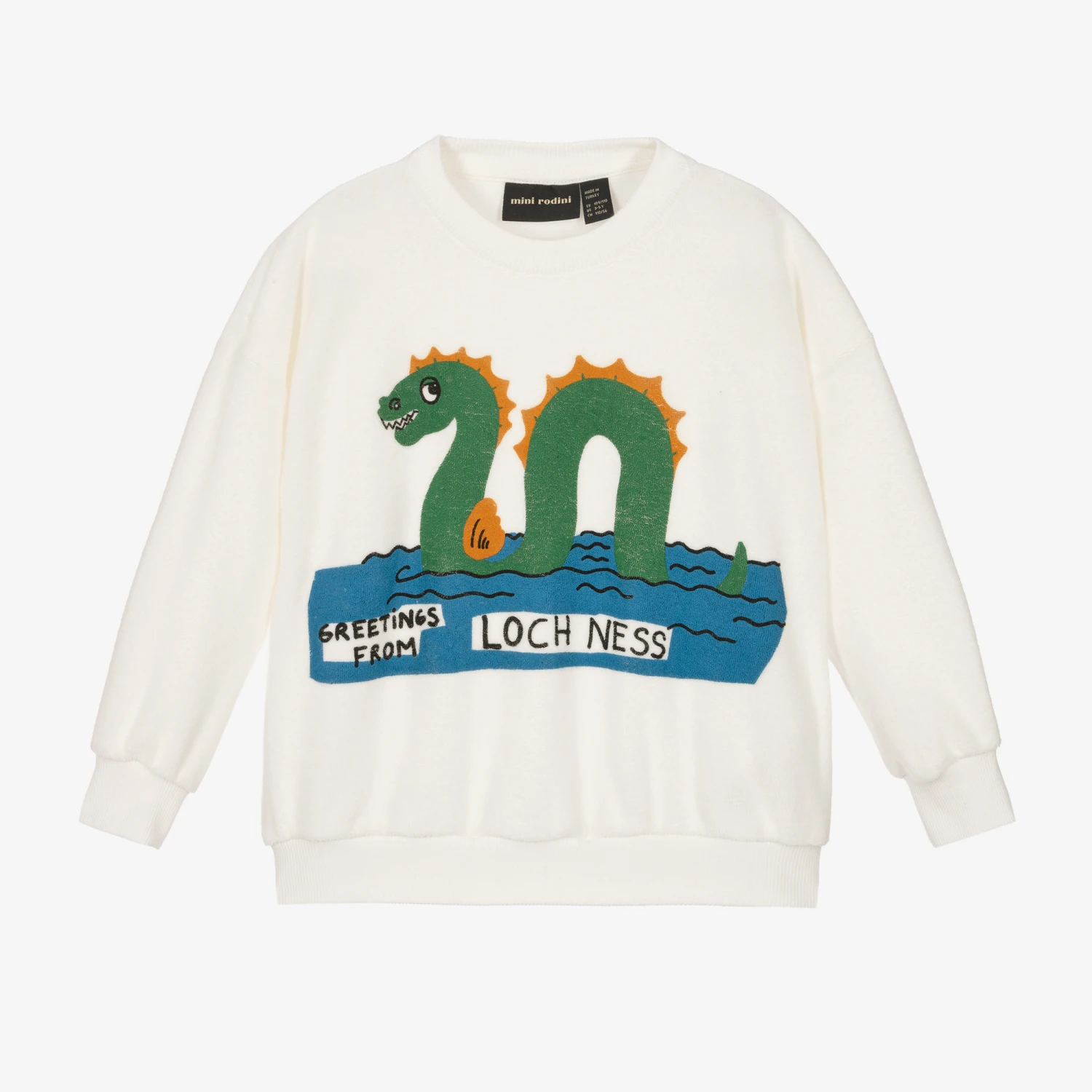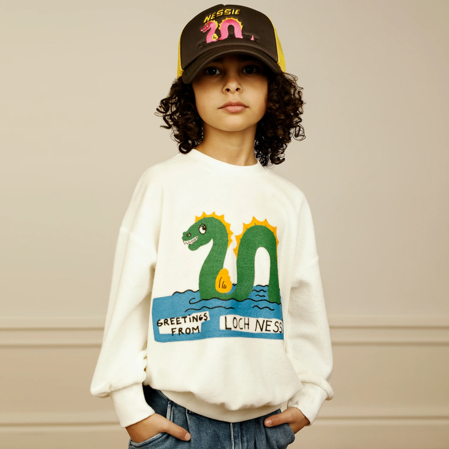Super soft ivory sweatshirt for boys and girls by Mini Rodini, made in organic cotton velour. The brand is known for their quirky designs and this top is no exception, with a fun green and blue Loch Ness monster print on the front.