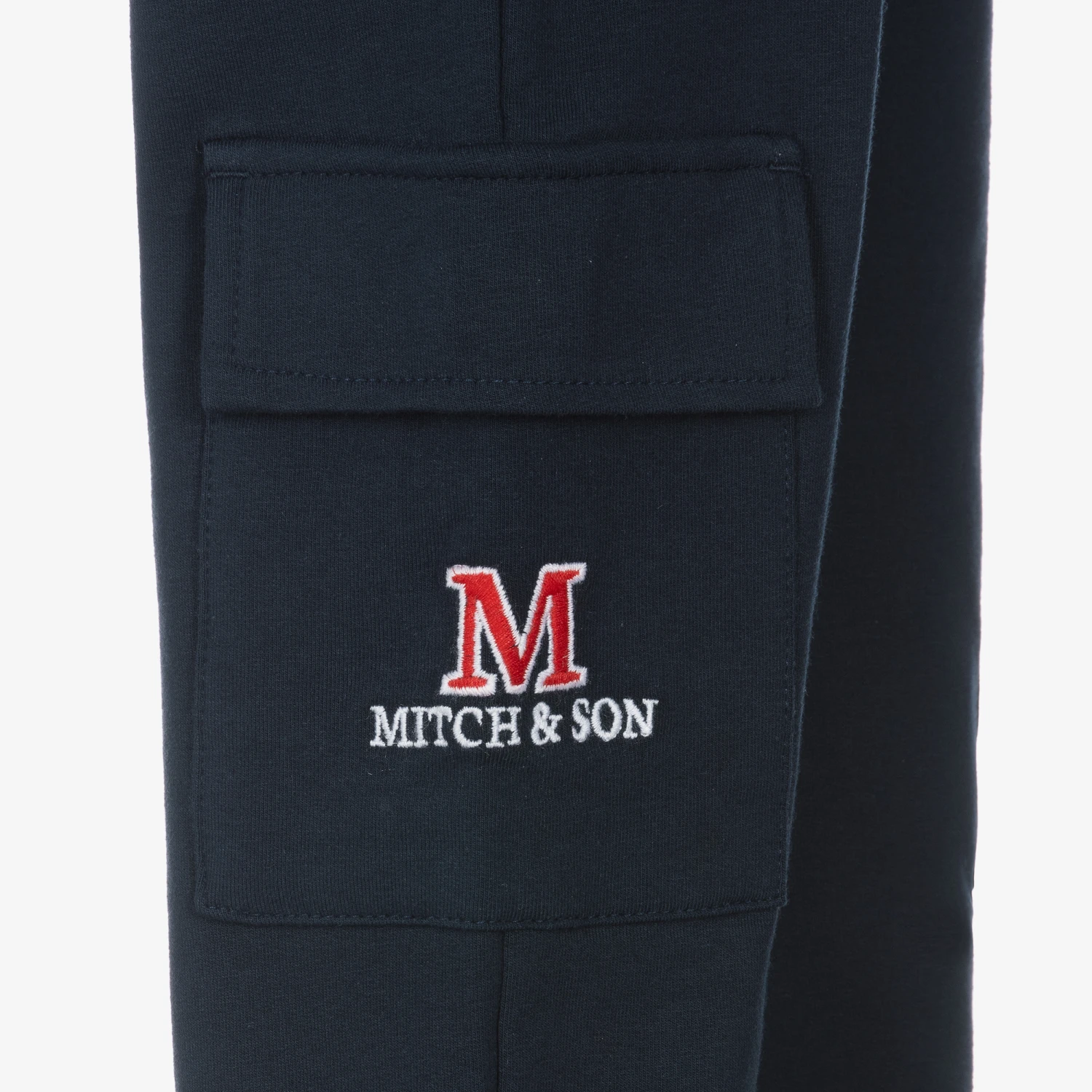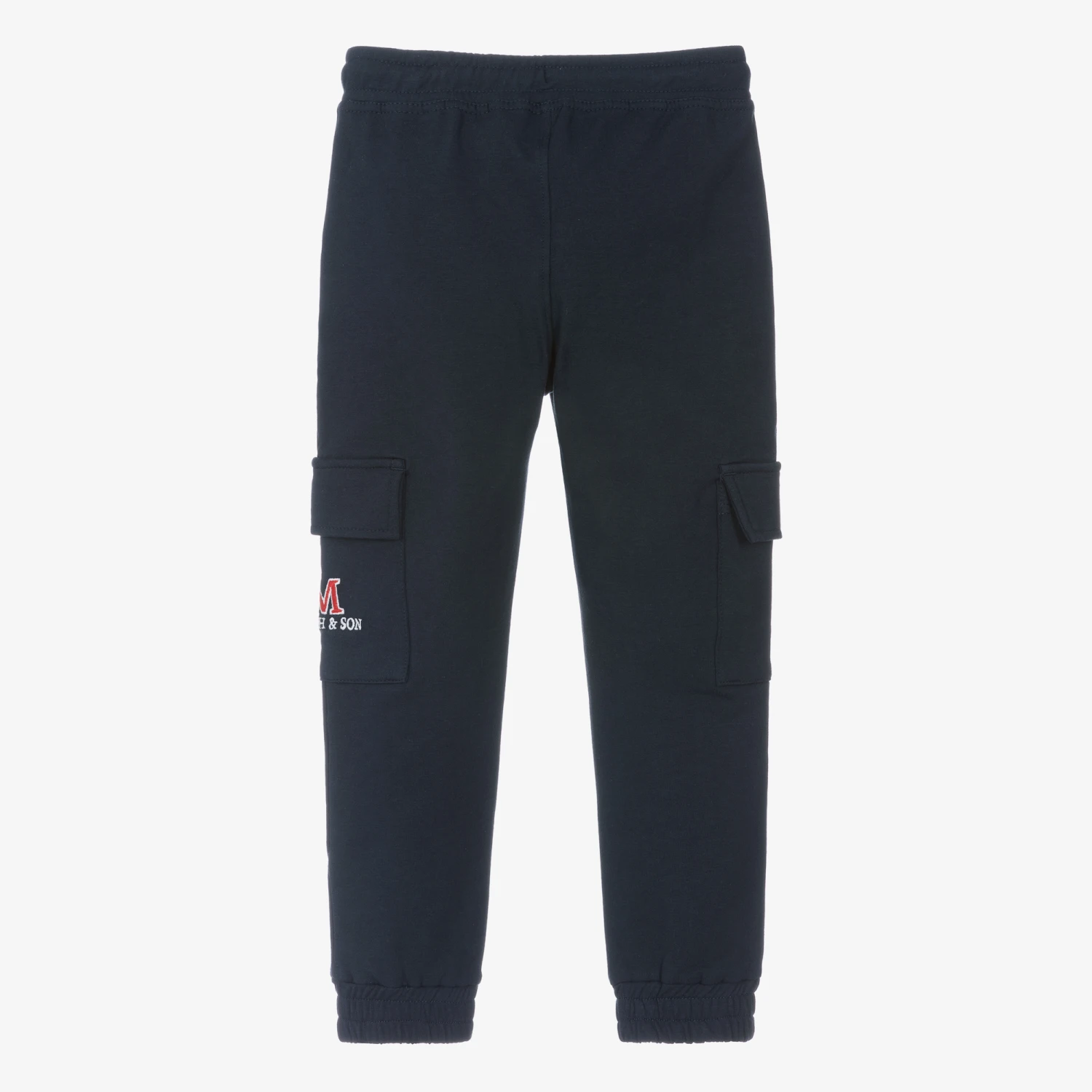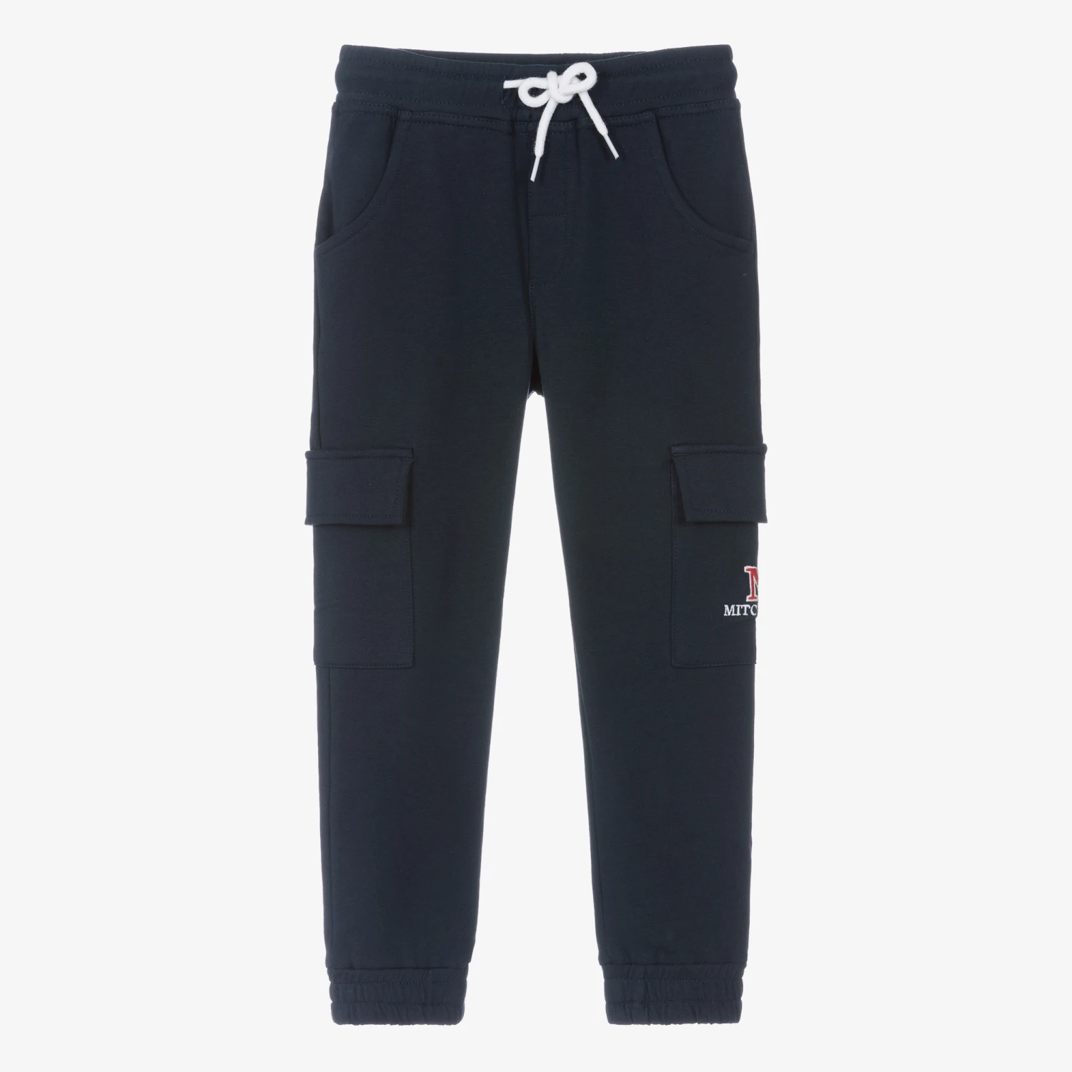 Navy blue cotton joggers for younger boys by Scottish brand Mitch & Son, made in comfortable jersey with a fleecy inside. With a cool, relaxed style, they have velcro-fastening cargo pockets on the legs, one of which is embroidered with the brand name. The stretchy, elasticated waistband has a decorative logo button in the centre and white drawstring ties for a great fit.