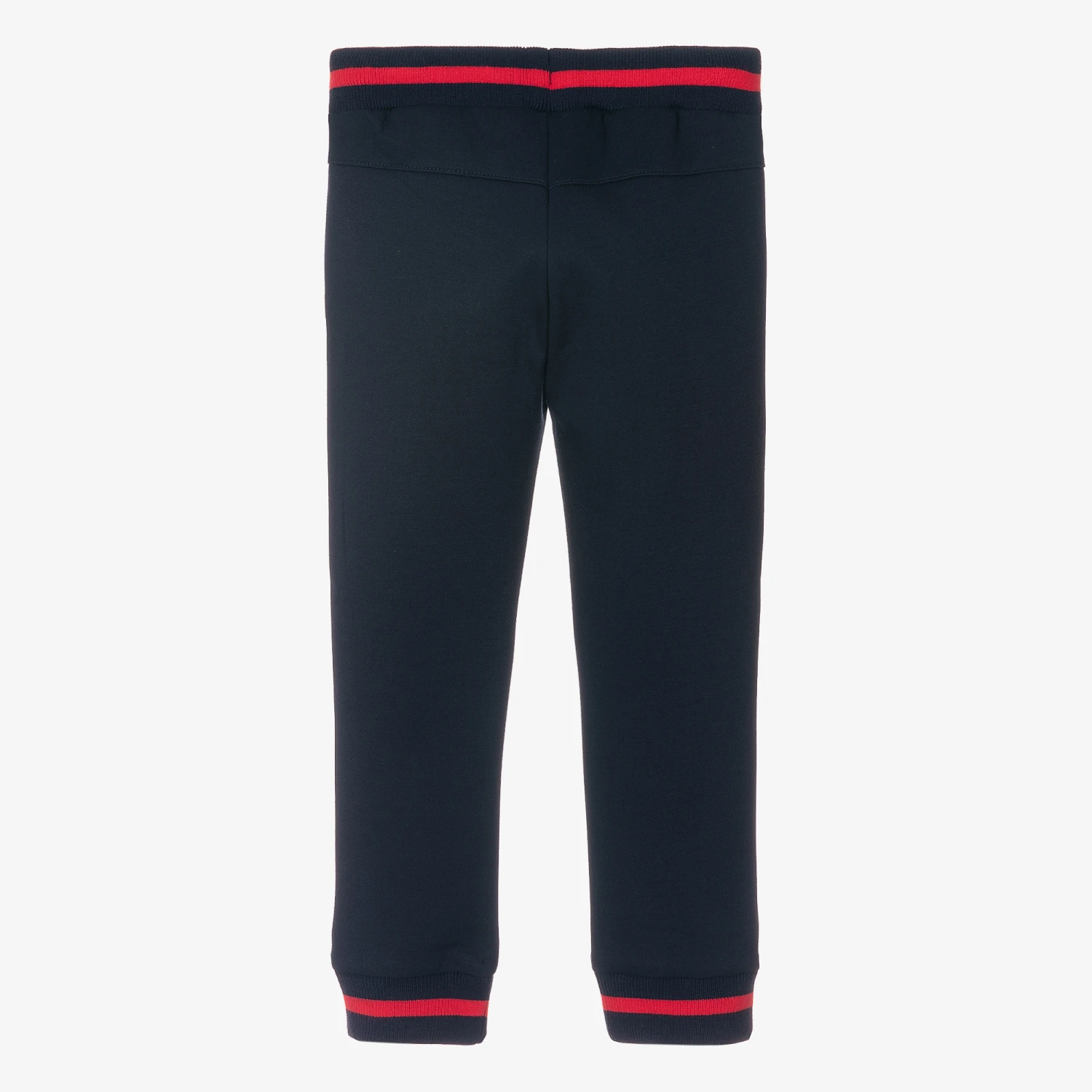 Navy blue joggers for boys by Mitch & Son, made in comfortable mid-weight jersey. They have a beige logo print on one legs and red stripes through the elasticated trims for a fun twist on a classic style. There are two useful pockets on the front and the waist can be adjusted with a drawstring for a better fit.