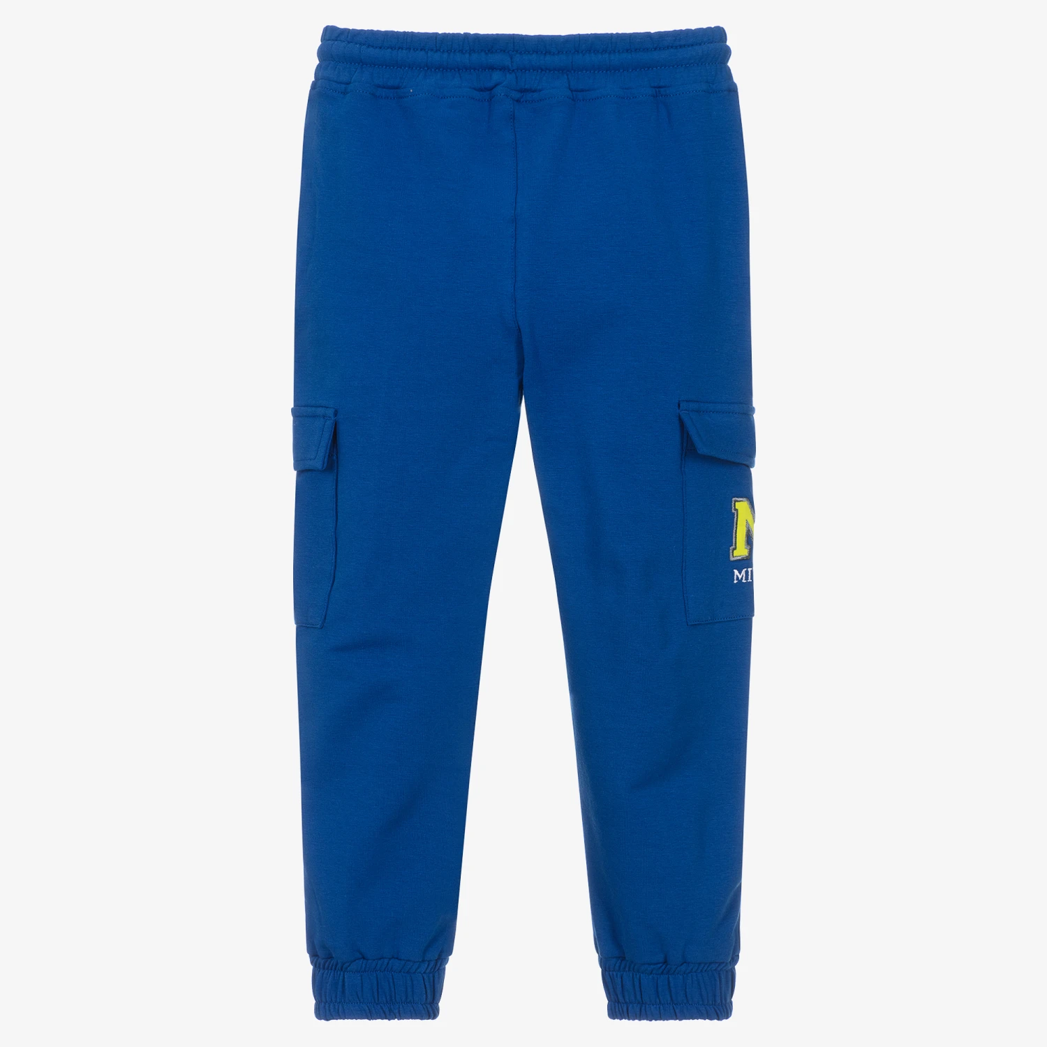 Royal blue cotton joggers for younger boys by Scottish brand Mitch & Son, made in comfortable jersey with a fleecy inside. With a cool, relaxed style, they have velcro-fastening cargo pockets on the legs, embroidered with the brand’s initials. The stretchy, elasticated waistband has a decorative logo button in the centre and patterned drawstring ties for a great fit.