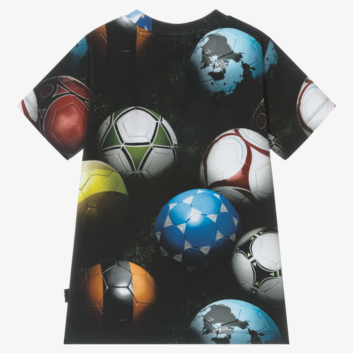 Fun black T-shirt for boys and girls by Molo, made in organic cotton jersey. Simply stylish it is has an all-over, hyper detailed print of footballs in different colours.