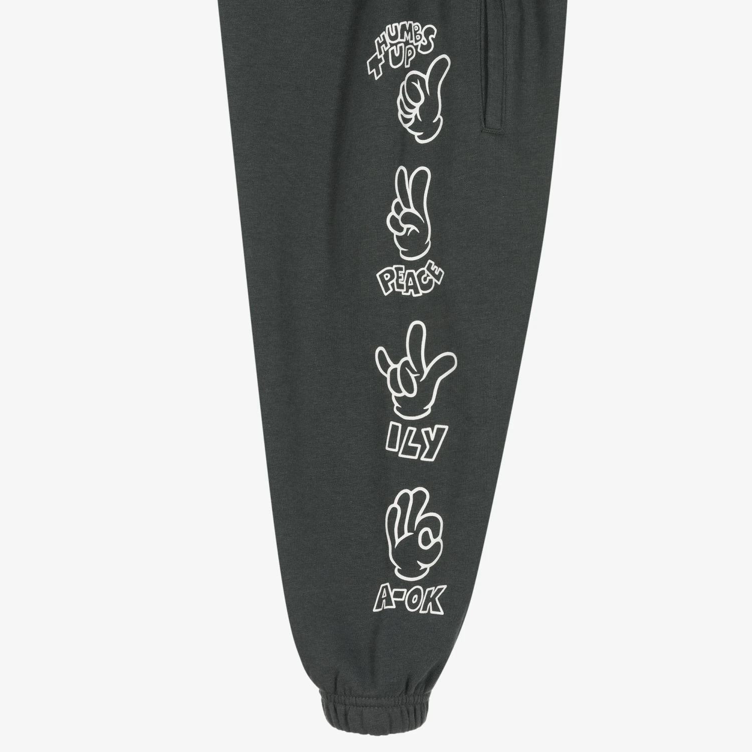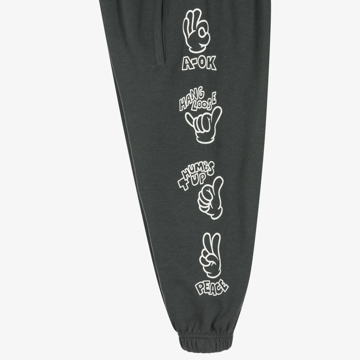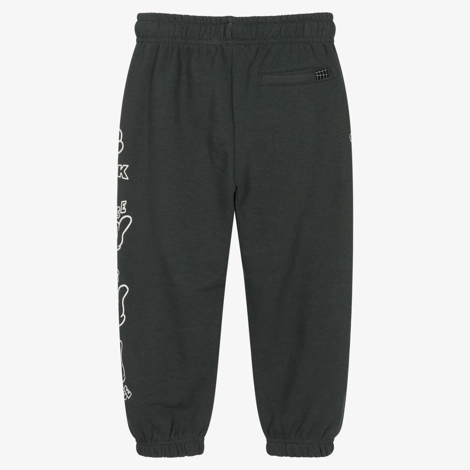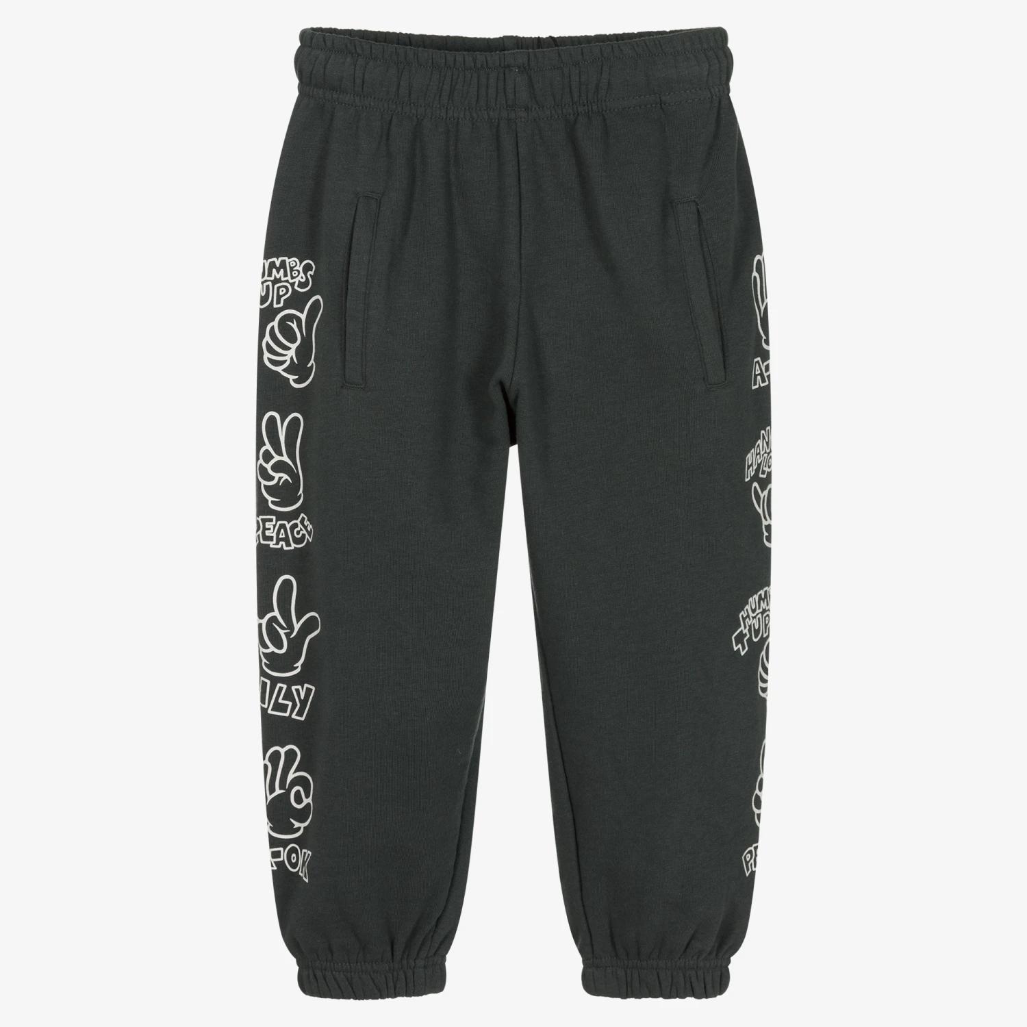 Charcoal grey joggers for boys by Danish brand Molo, made in the softest cotton jersey. Complementing the brand’s cool and fun vibe, there are white cartoon-style hand symbols printed on the sides. They have comfortable pockets and elasticated cuffs, with an internal drawstring waistband for an adjustable fit as your child grows.