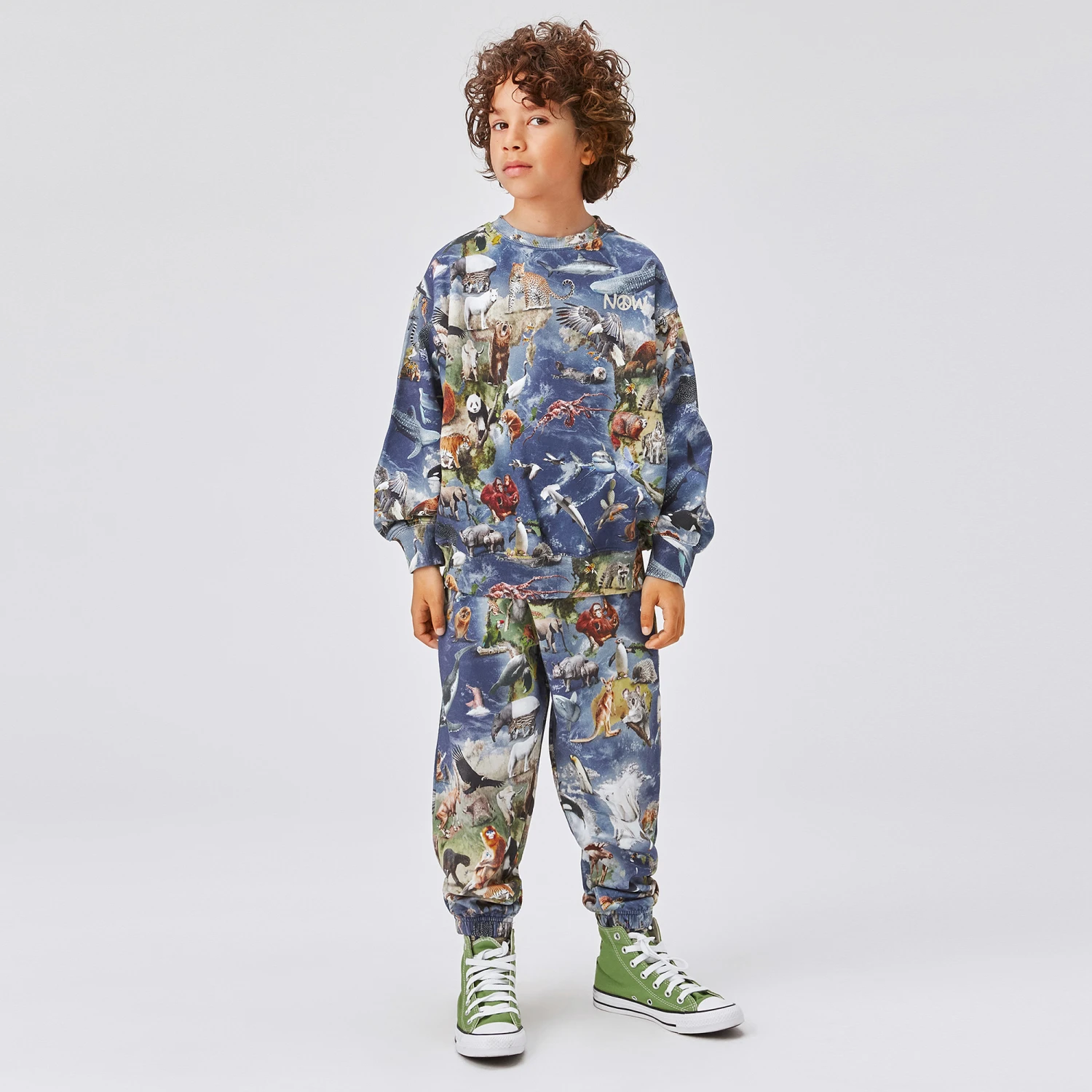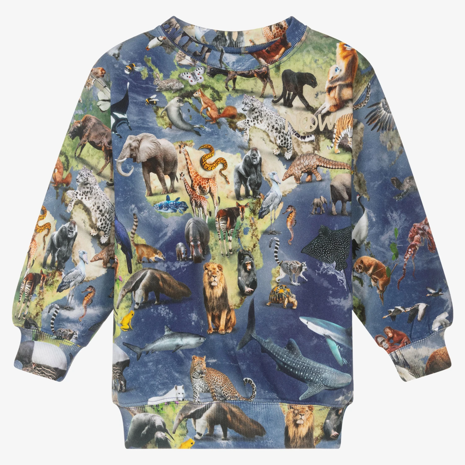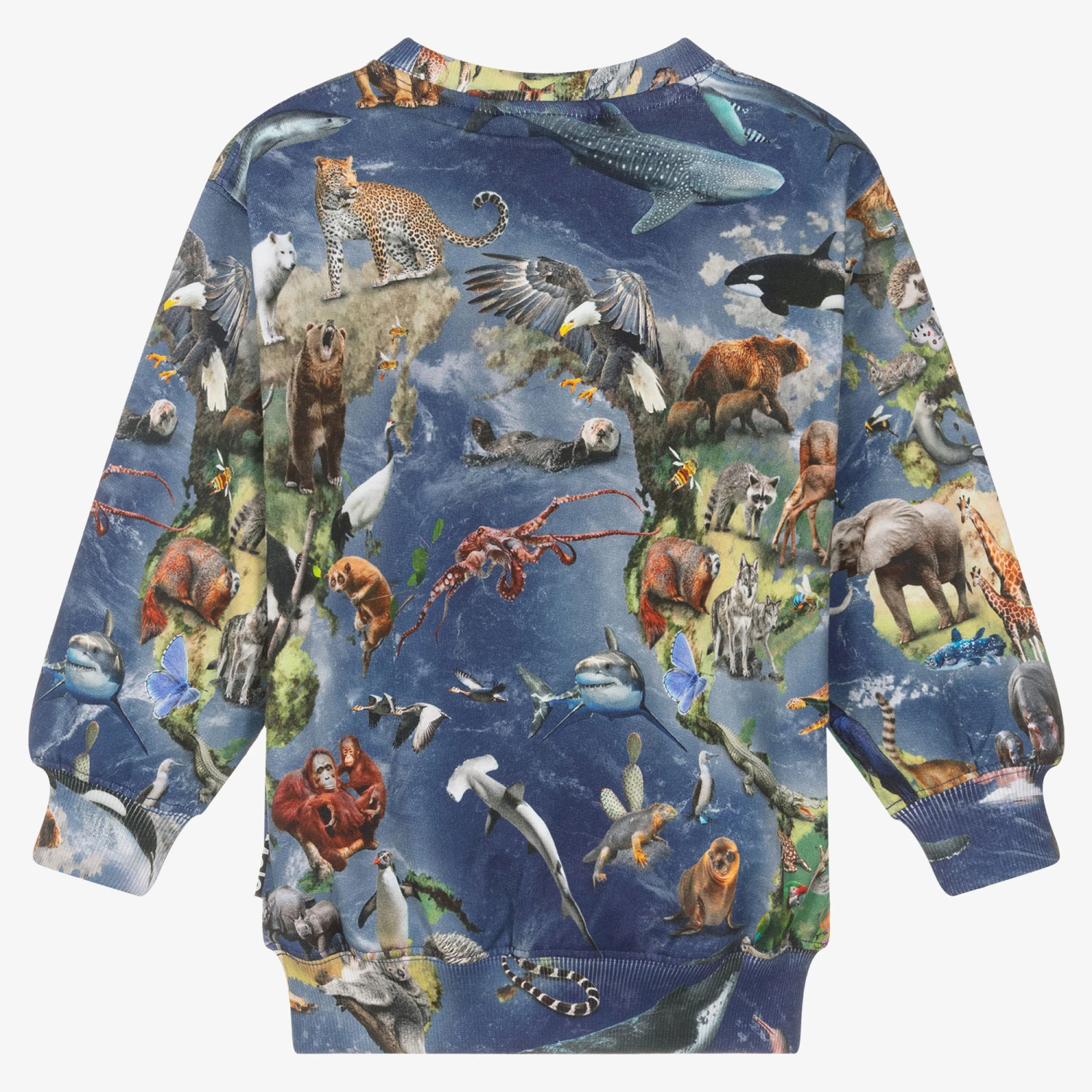 Blue crew neck sweatshirt for boys and girls by Molo, made in soft organic cotton jersey. Great for nature lovers, it has a vibrant and quirky animal print all-over, featuring a variety of animals from all-over the world.