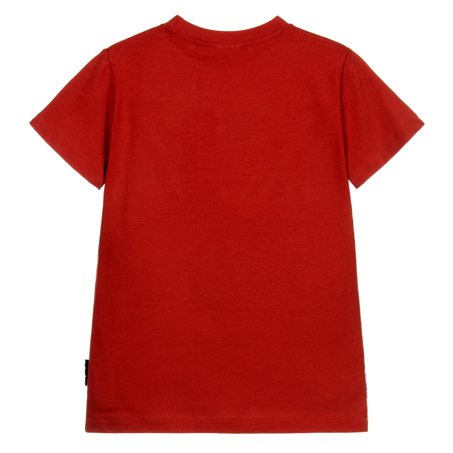 Boys organic cotton T-shirt by Molo, in a warm rusty red with a green T-Rex print on the front.