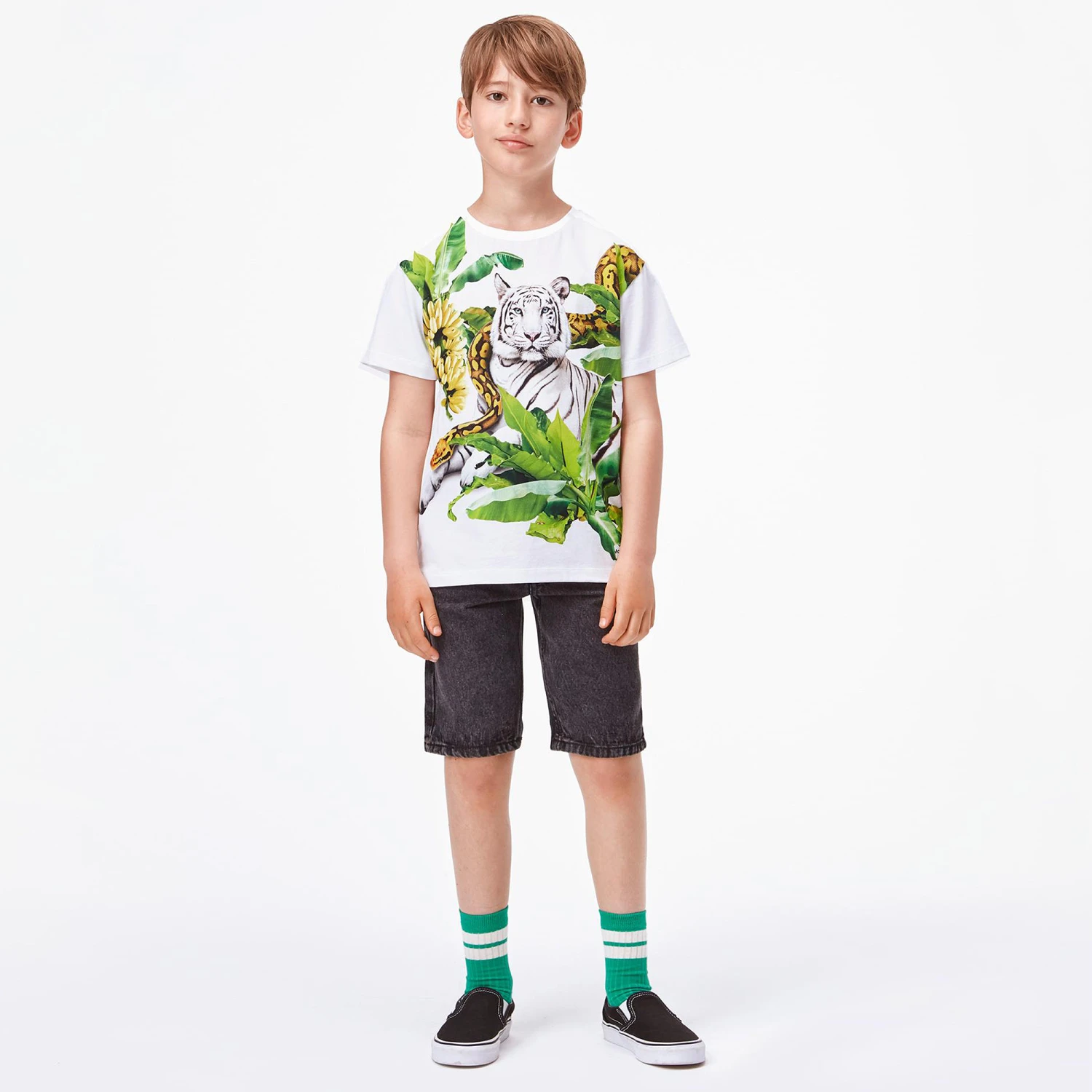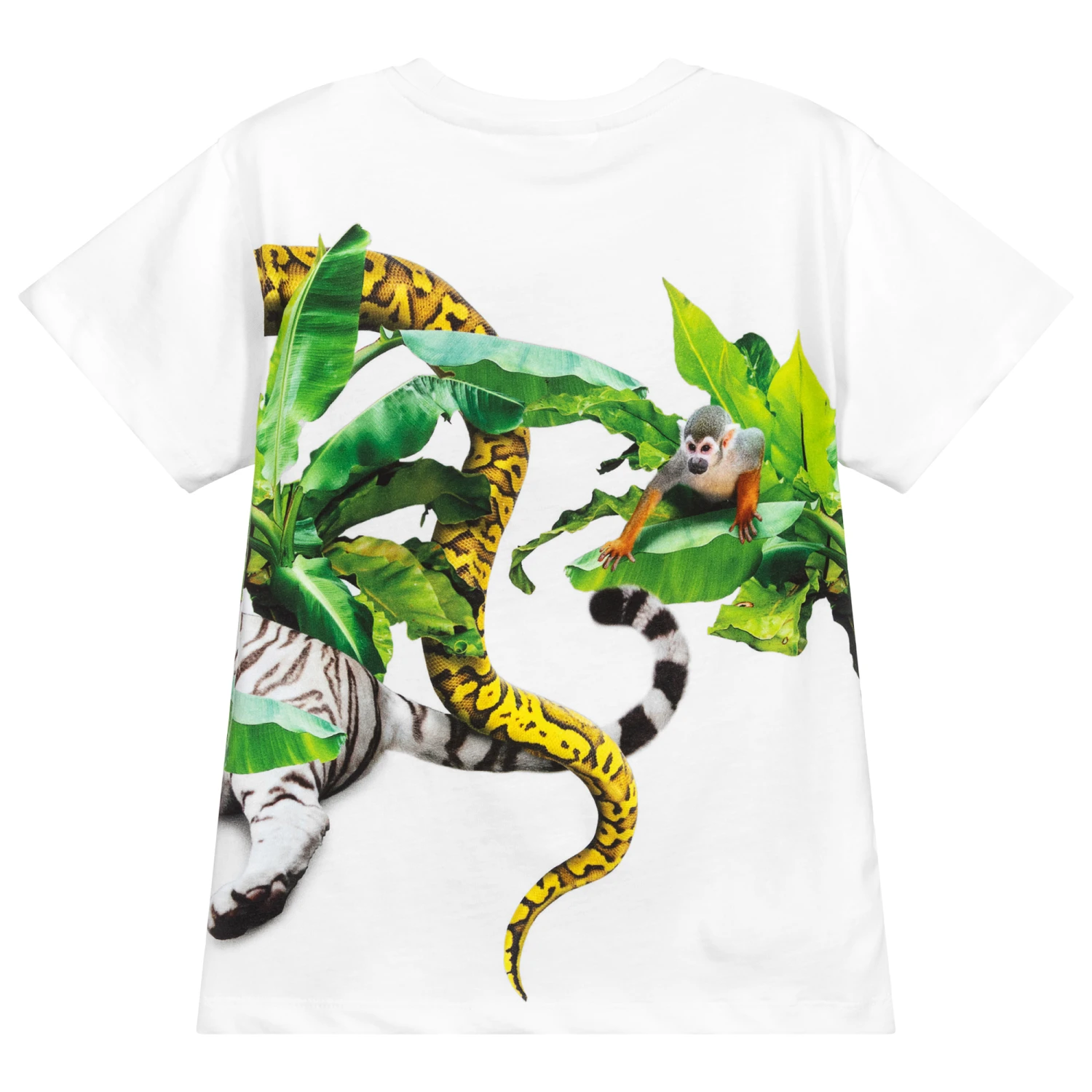 White T-shirt for boys by Molo, made in soft and stretchy organic cotton jersey. It has a green jungle print, with a white tiger and yellow snake on the front and a monkey on the back.