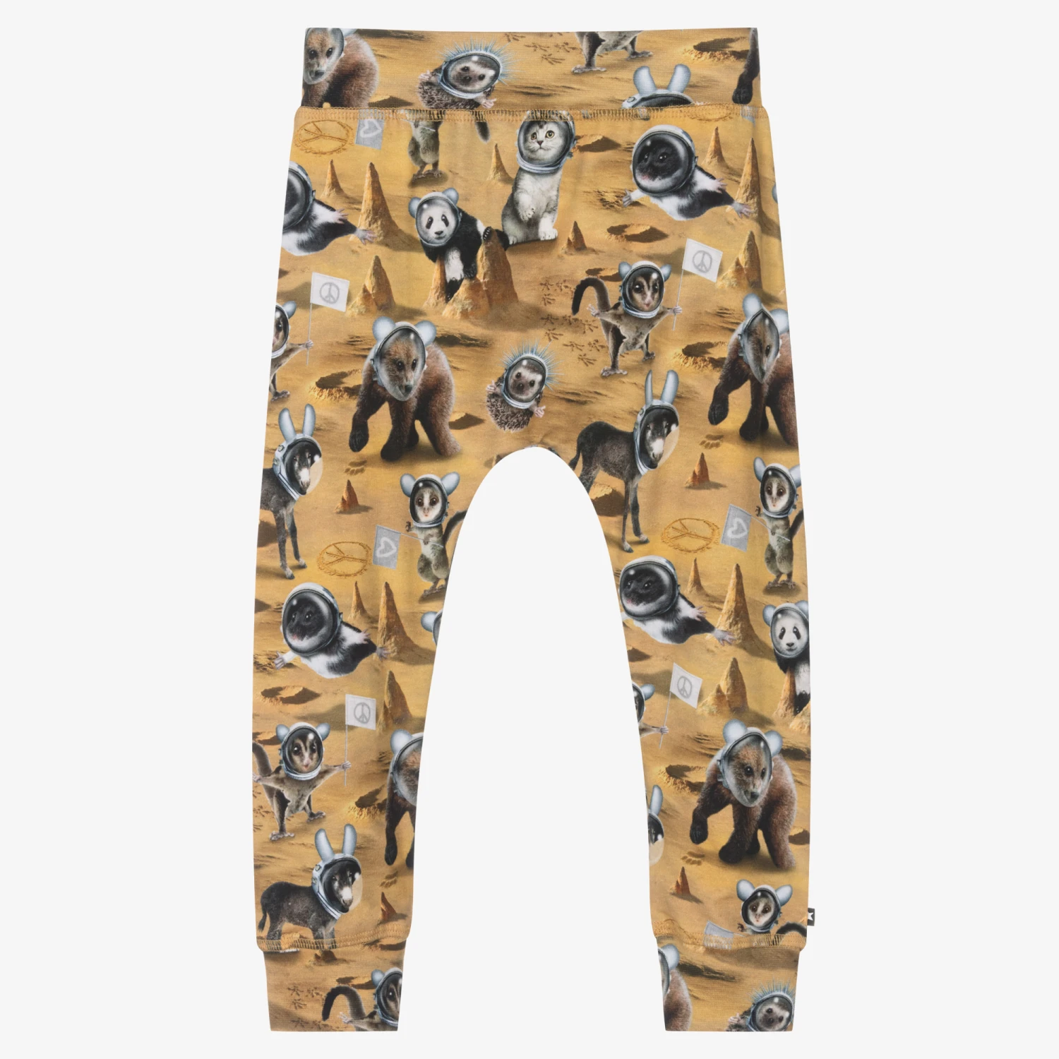 Mustard yellow joggers for little boys by Molo, made in soft organic cotton jersey. A hallmark of Molo’s style, these bottoms feature a hyper detailed print depicting a variety of cute animals on a planet’s surface, wearing astronaut helmets.