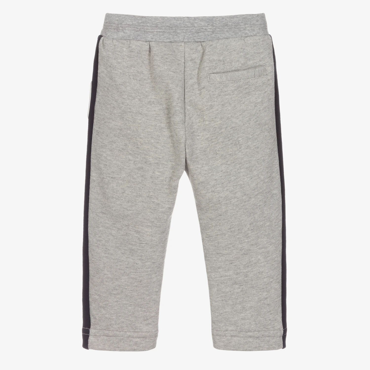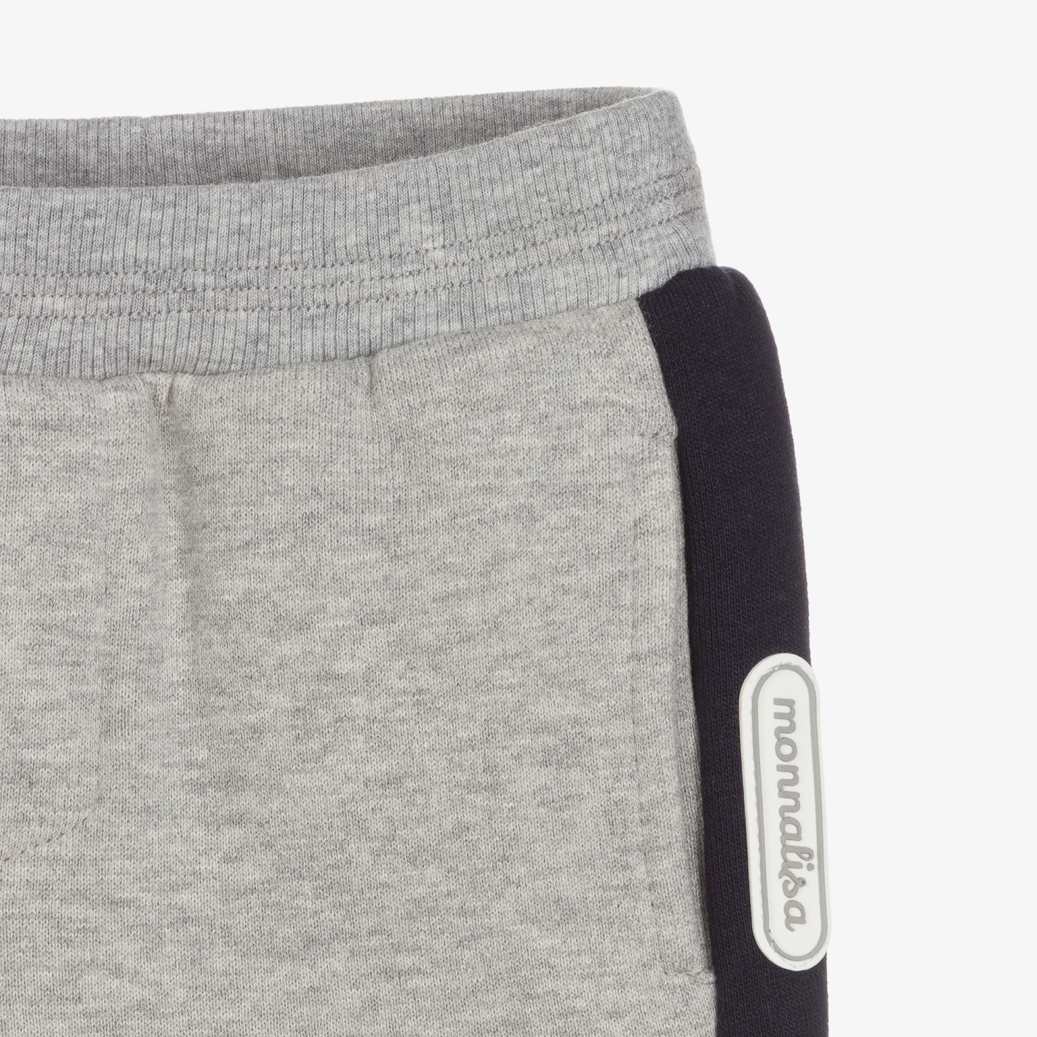 Comfortable grey marl joggers for little boys from Monnalisa, with navy blue side stripes and a rubberised logo patch. Made in soft cotton sweatshirt jersey with a fleecy feel inside, they have an elasticated waistband, useful side pockets and a faux pocket detail on the back.