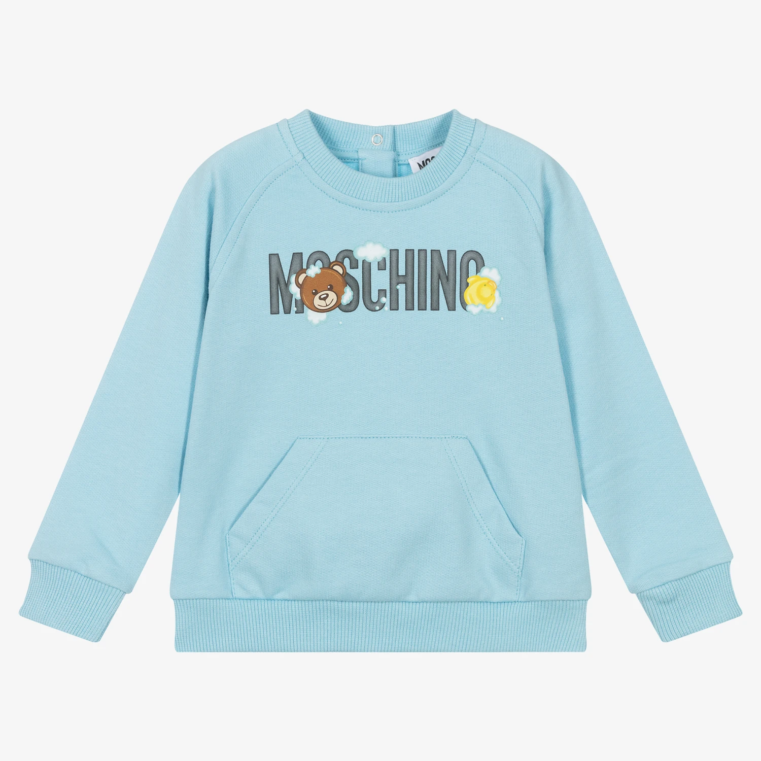 Pale blue organic cotton sweatshirt for little boys and girls from Moschino Baby. This sweet top has the Italian label’s iconic Moschino Teddy Bear print with grey logo lettering, a rubber duck and bubbles. It is made in soft mid-weight jersey with a front pouch pocket and easy-to-fasten poppers on the back.