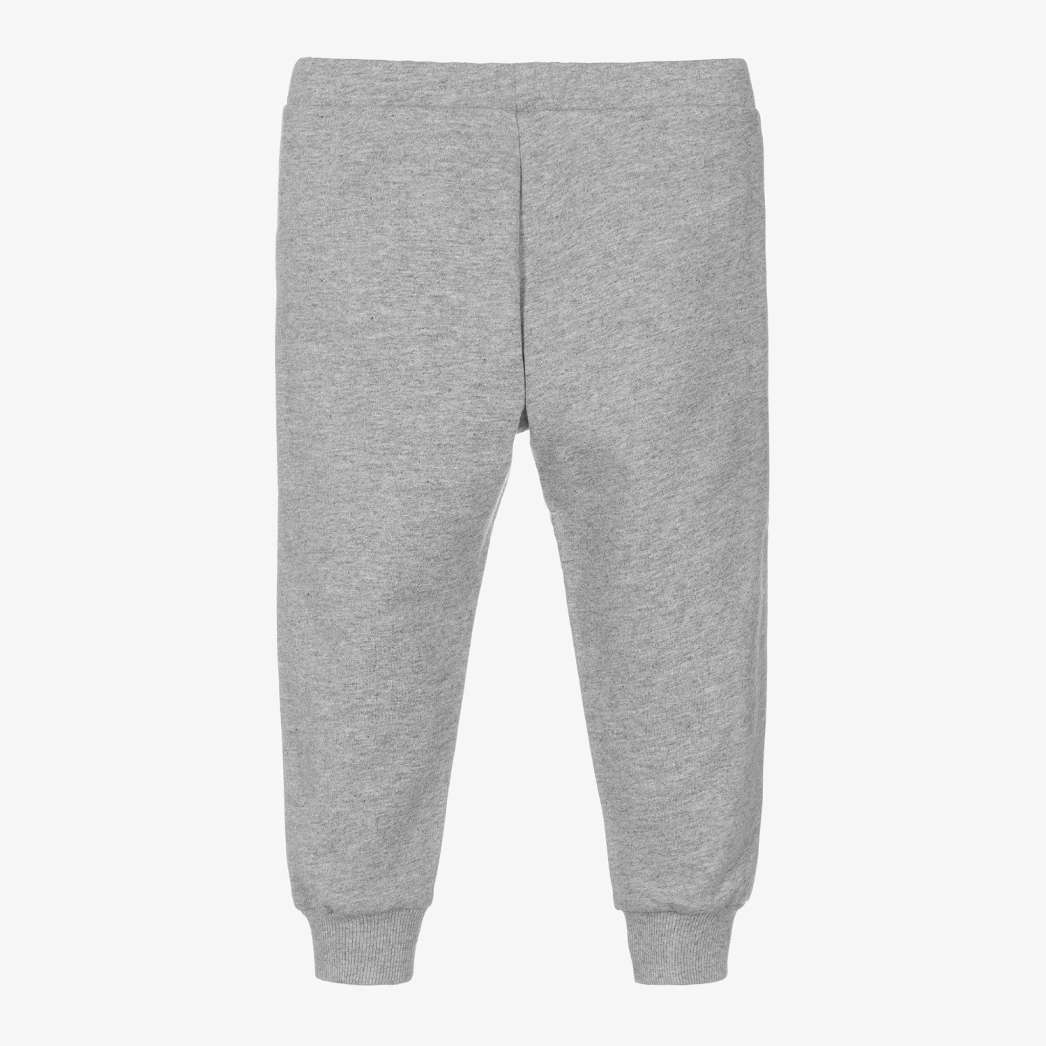 Grey marl joggers for little boys and girls by Moschino Baby. For instant designer appeal, they have an embroidered black logo together with the Moschino Teddy Bear logo print on the front. They are made in soft organic cotton jersey with a cosy fleece feel inside and have slanted pockets on the front.