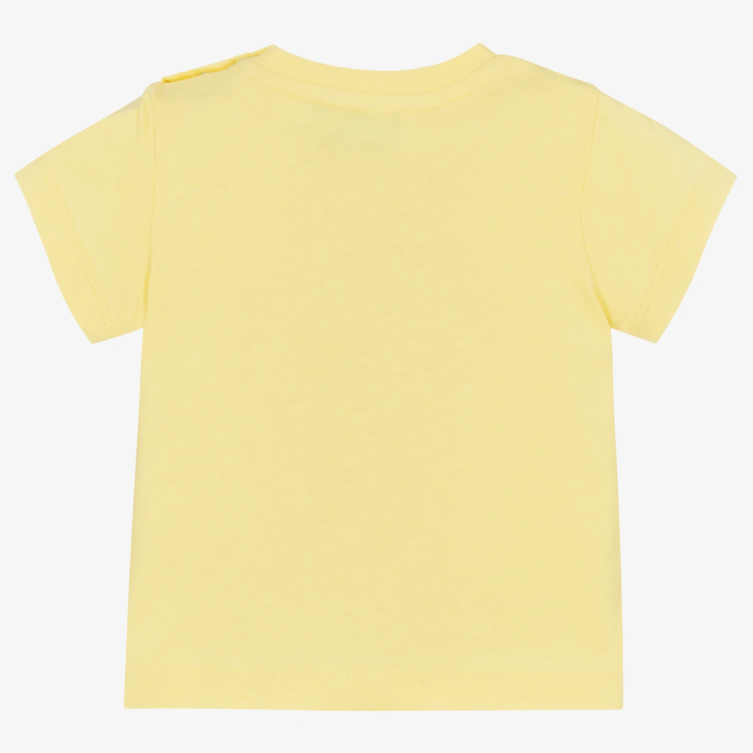 Yellow T-shirt for little boys and girls by Italian brand Moschino Baby, with the brand’s iconic Teddy Bear logo printed on the front. Made in luxuriously soft cotton jersey, there are popper fastenings on one shoulder for simple dressing.